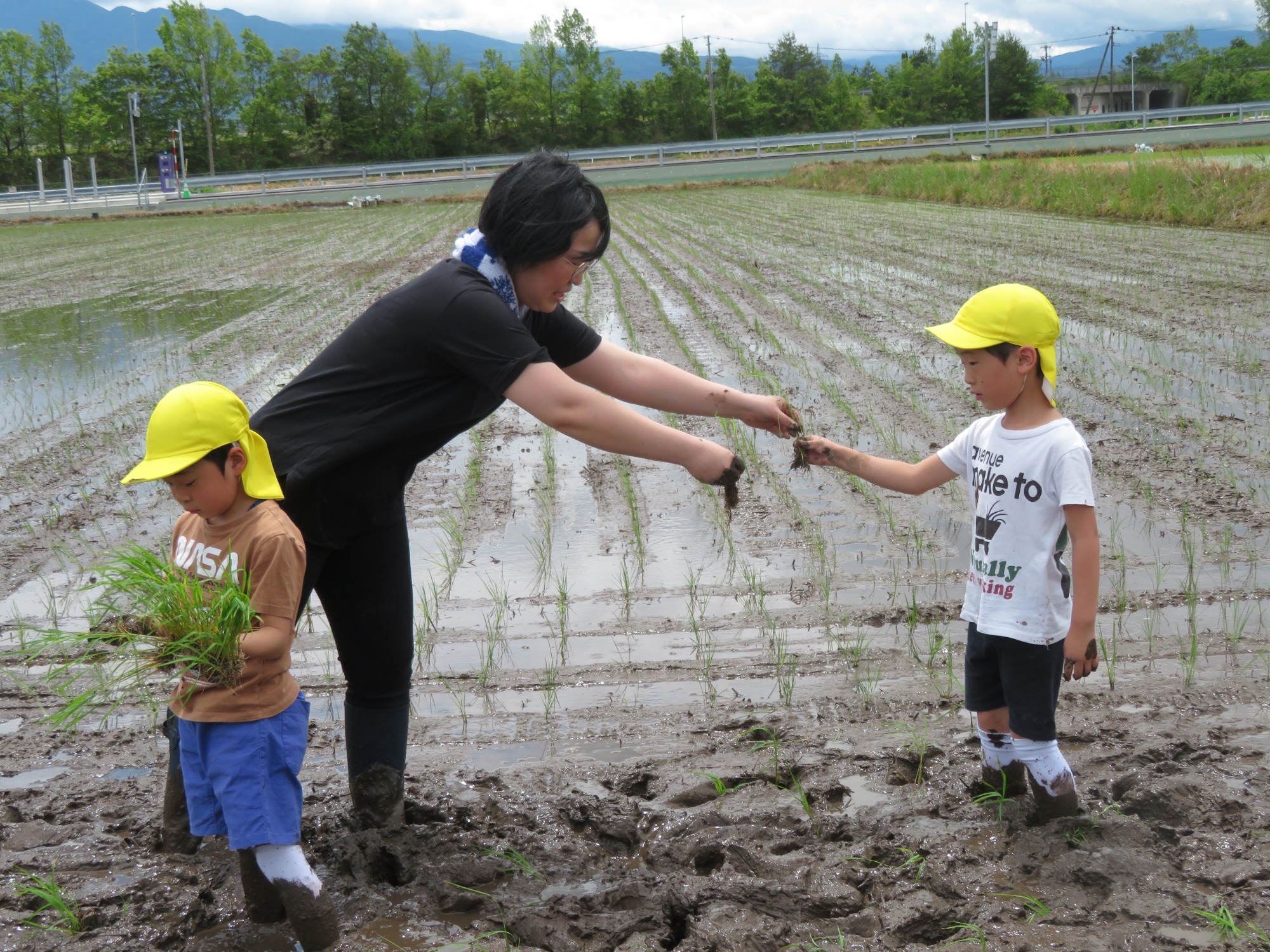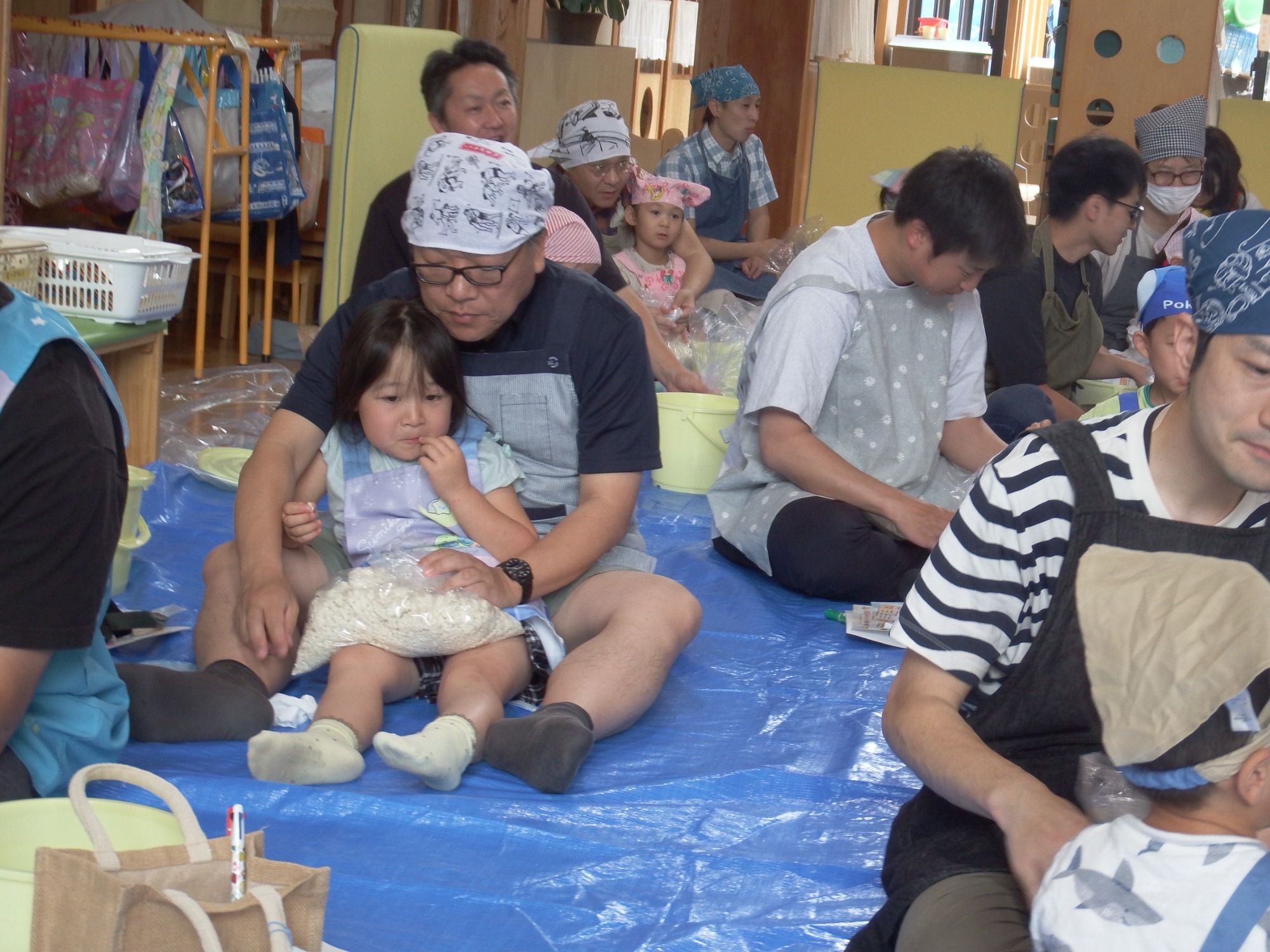 年長クラスのお家の方には、一緒に田に入りお手伝いをしていただきました。