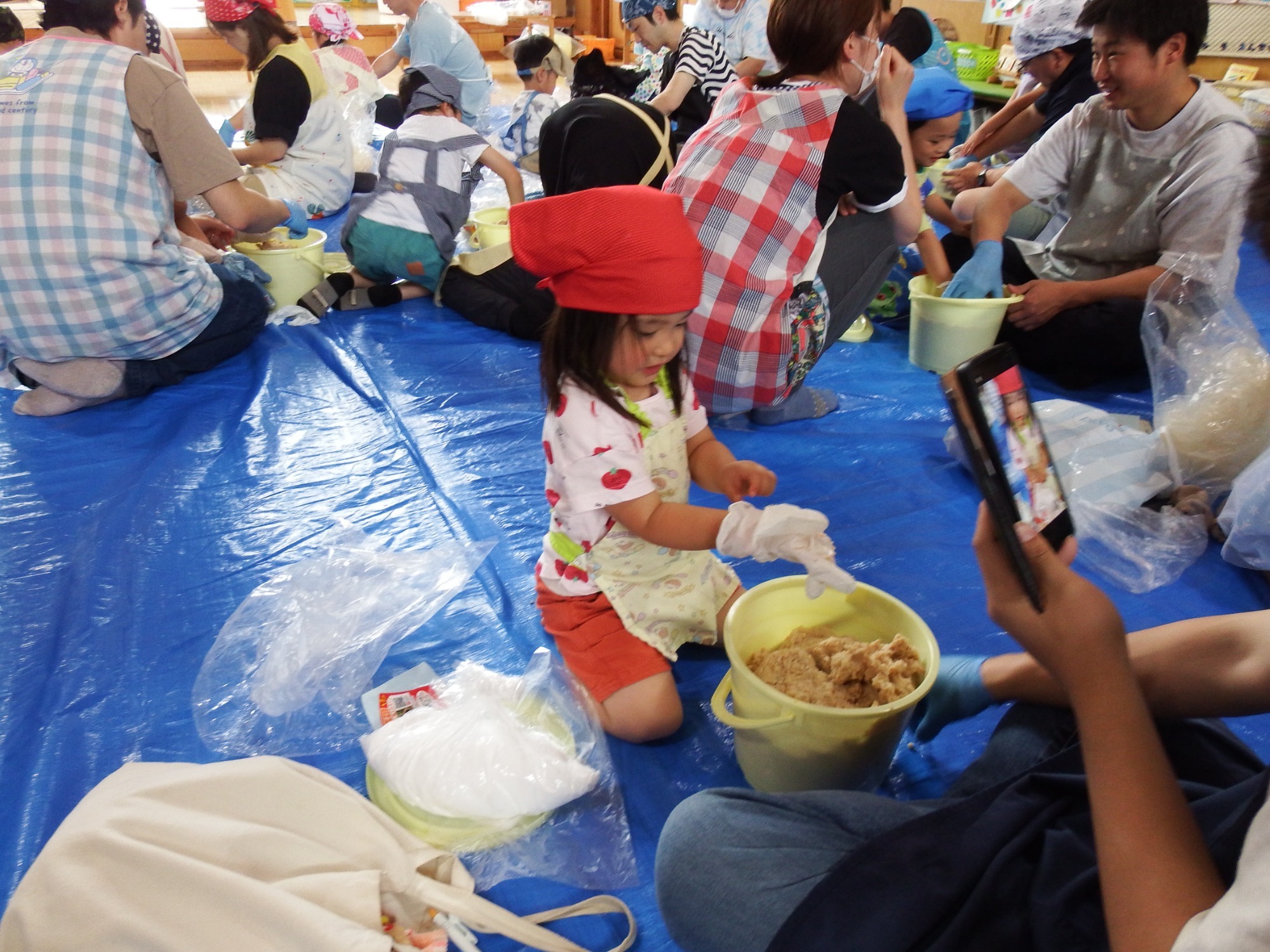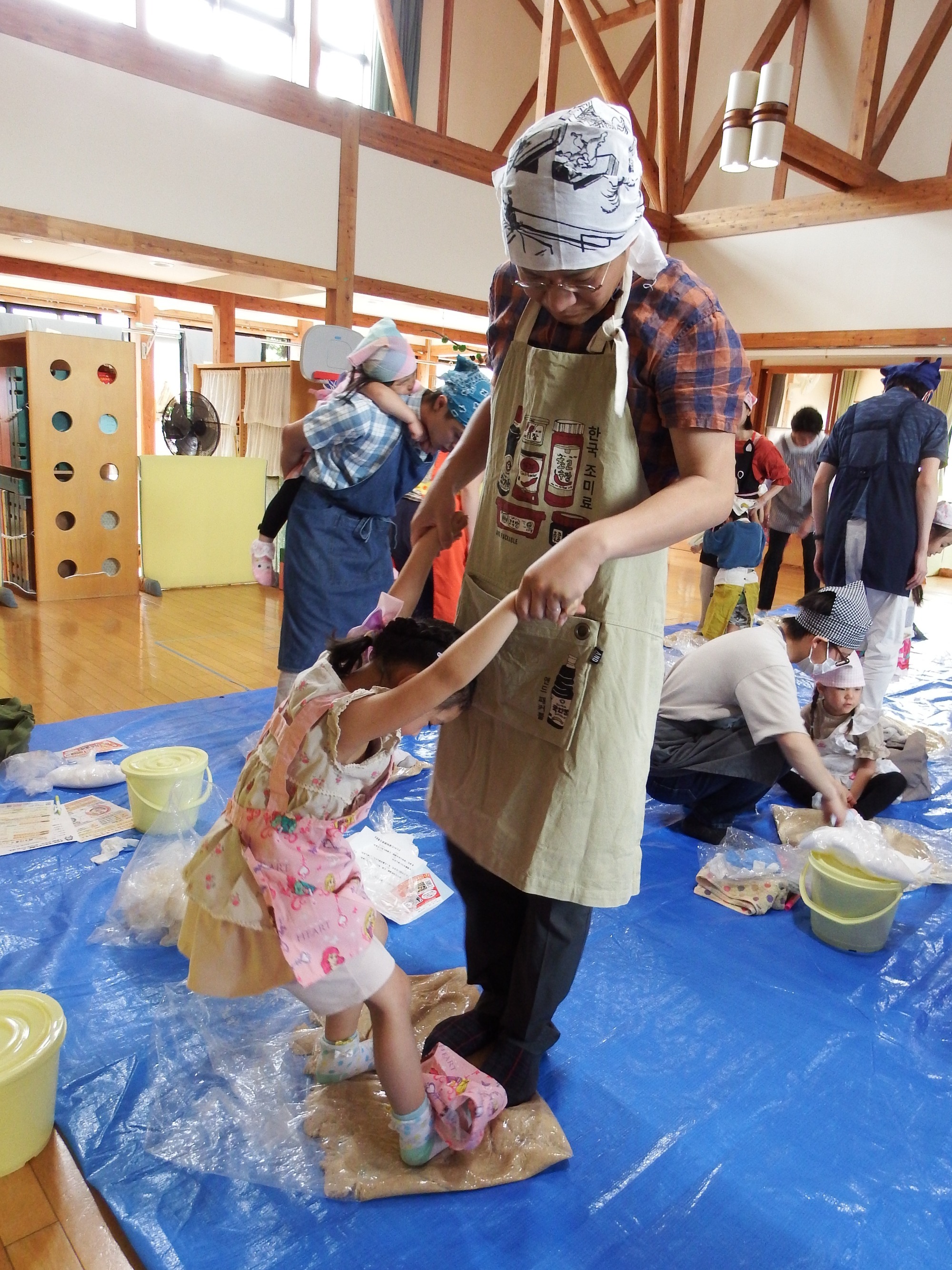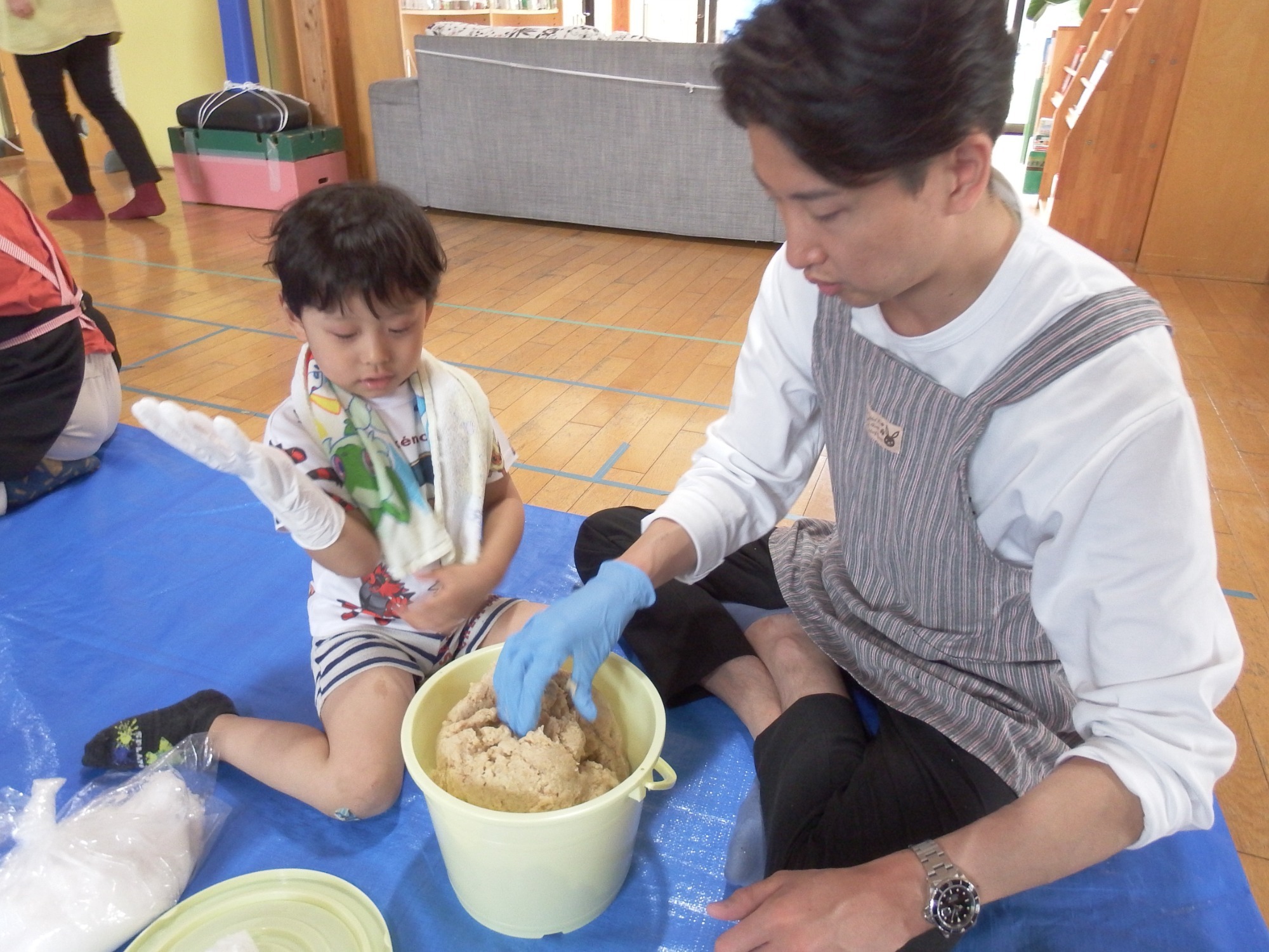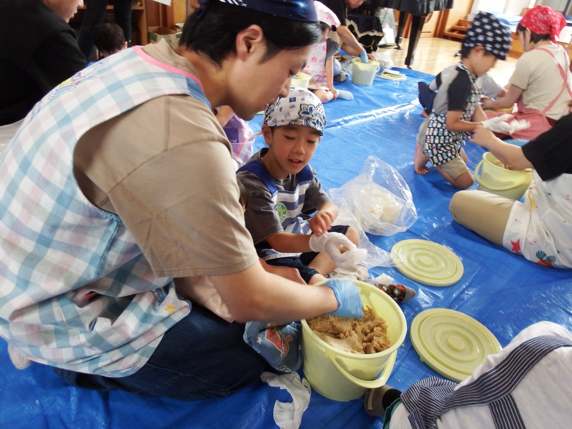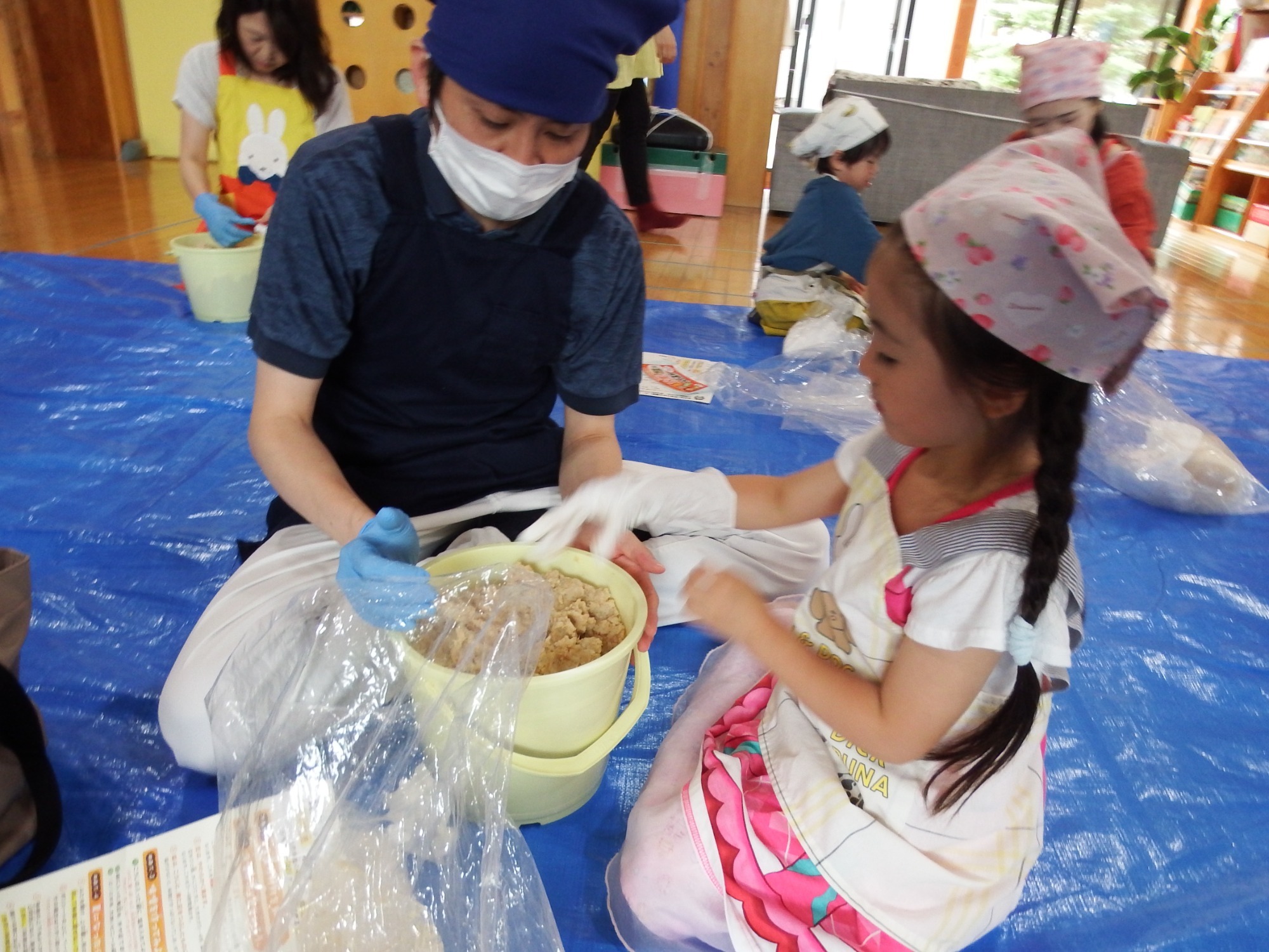 毎年恒例の味噌づくり、親子で触れ合い時々甘えん坊になりながら、身体にやさしく元気をくれる「手作り味噌を作ろう」ということで、親子で協力して取り組みました。