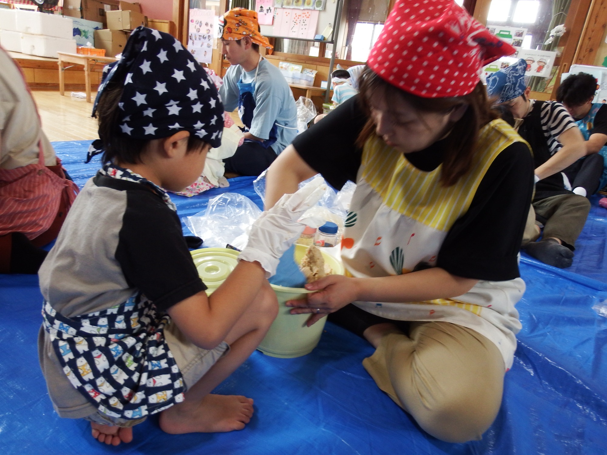 体験の中で材料の麹や蒸かした豆の味見をしてみました。麹は味の感じ方はそれぞれだけど甘いことを知り、蒸かした大豆の美味しさ、麹と塩と大豆が混ざるとおいしく感じることを確かめました。地元、山形産のお米と大豆を使った味噌ダネはおうちで熟成して8月に完成予定です。