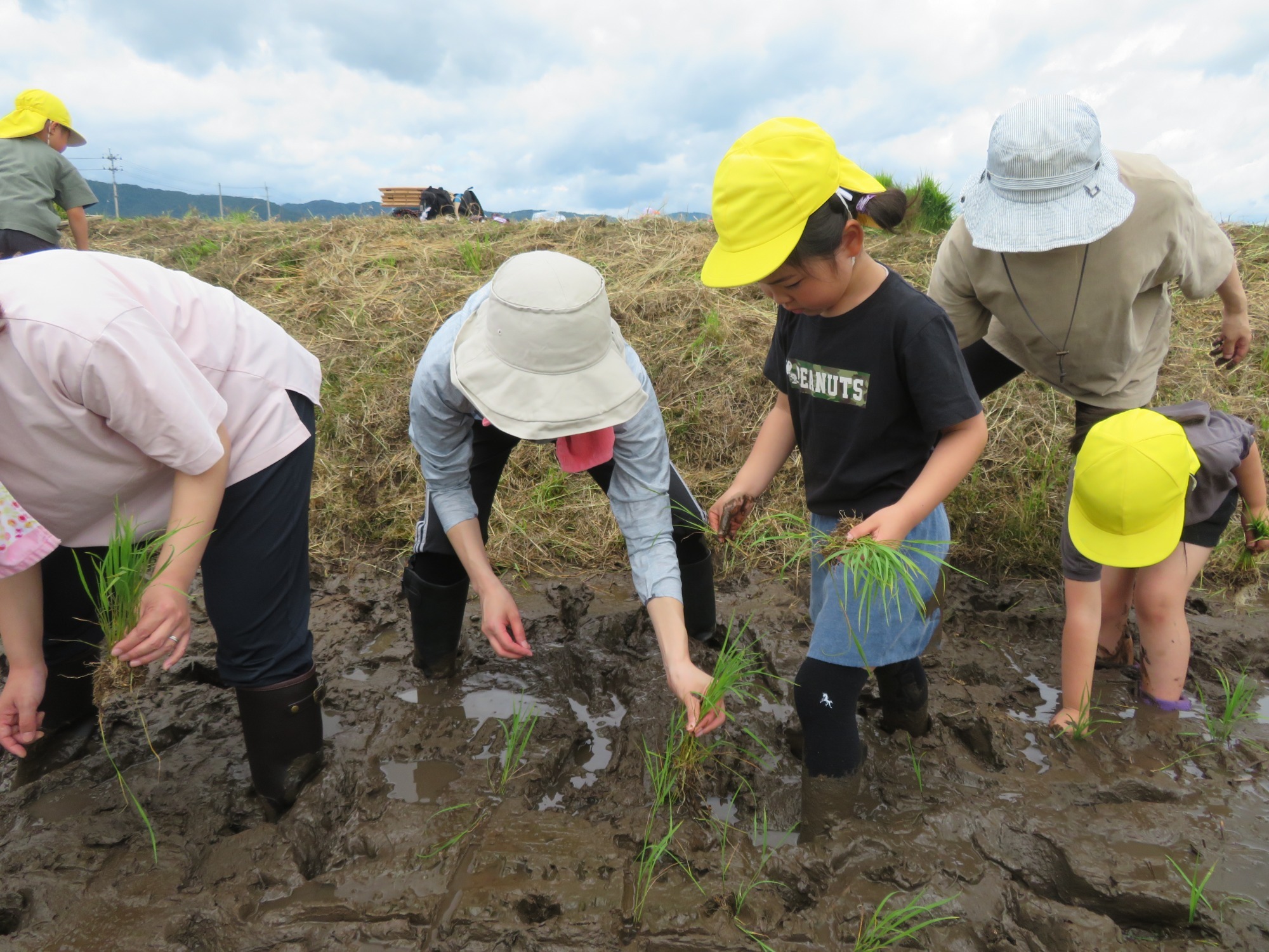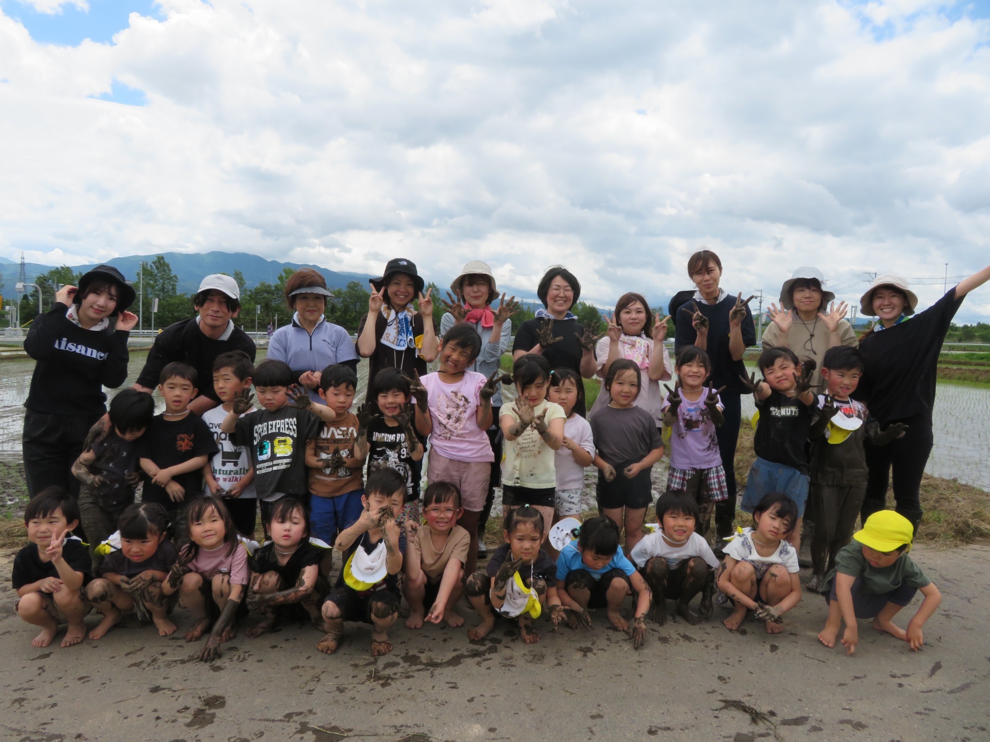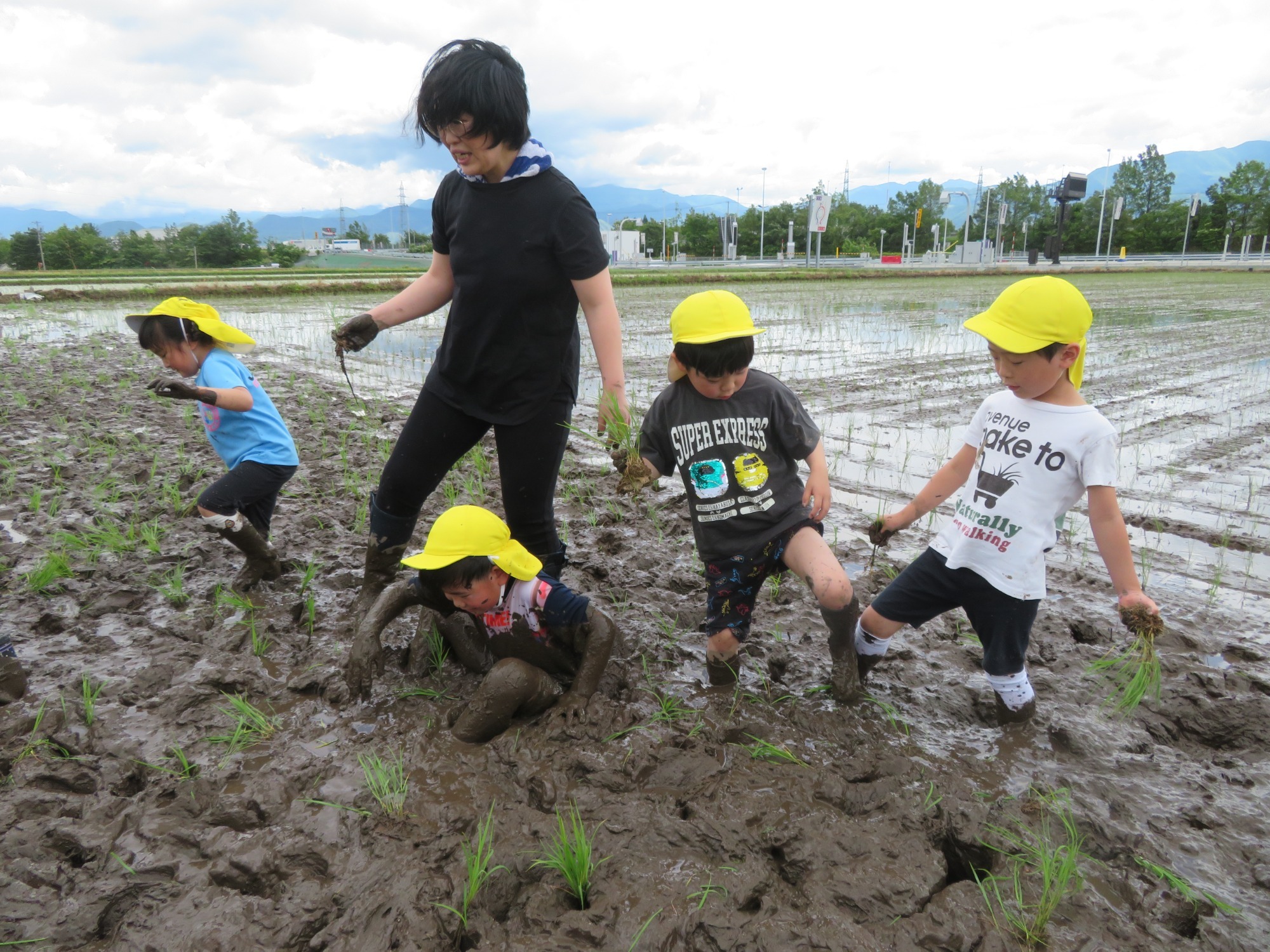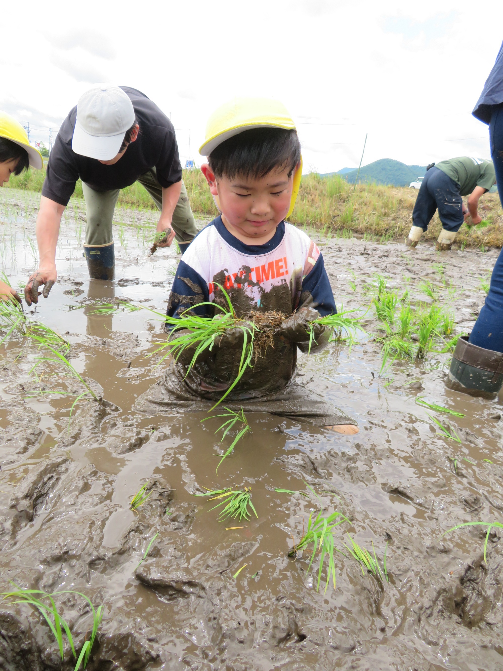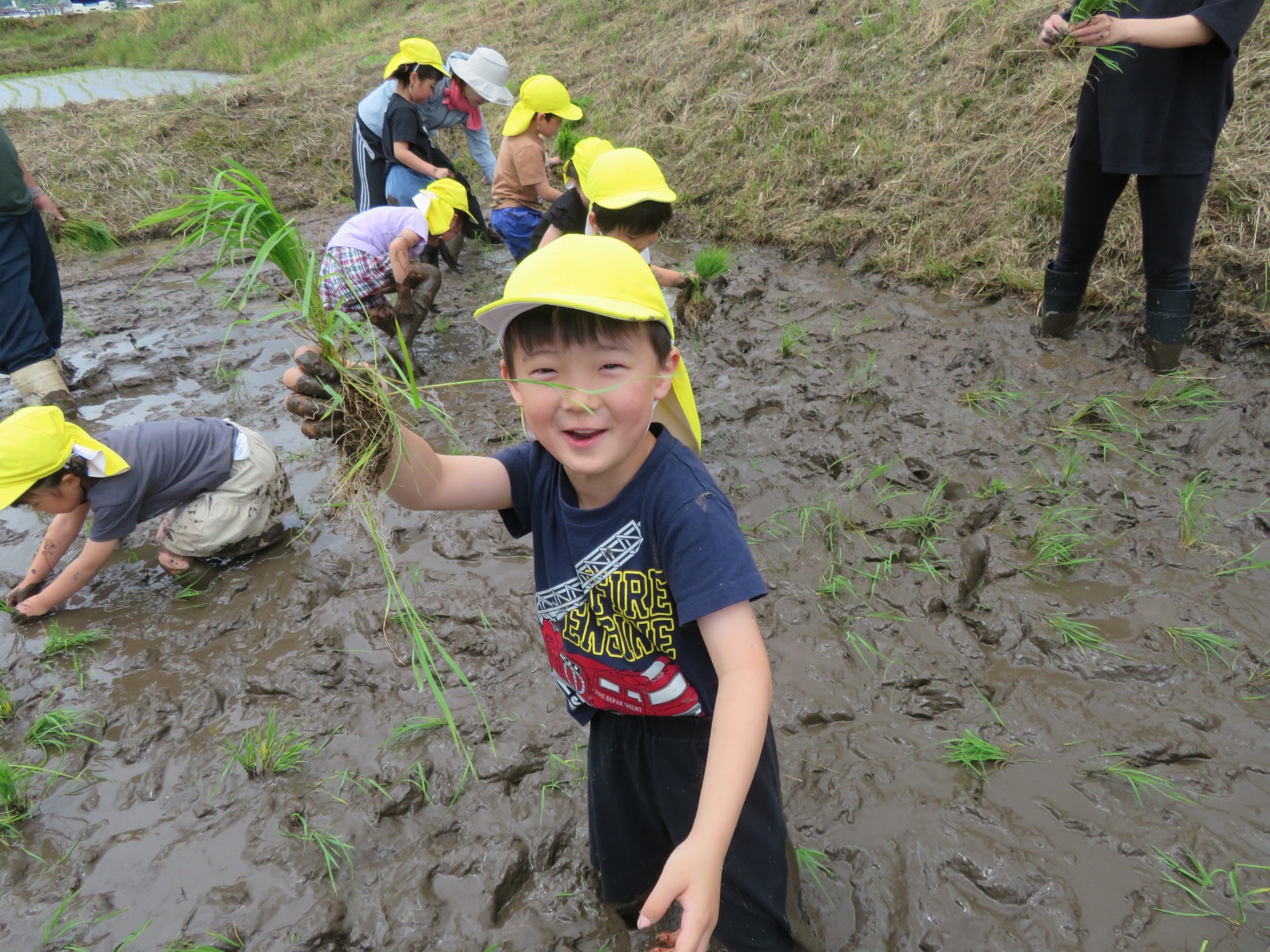泥の感触を存分に味わい、しりもちをついたり顔に泥はねがついたり、全身泥んこまみれになって楽しみました。秋の収穫が楽しみです。