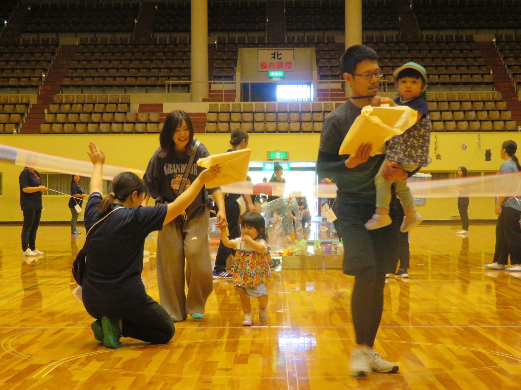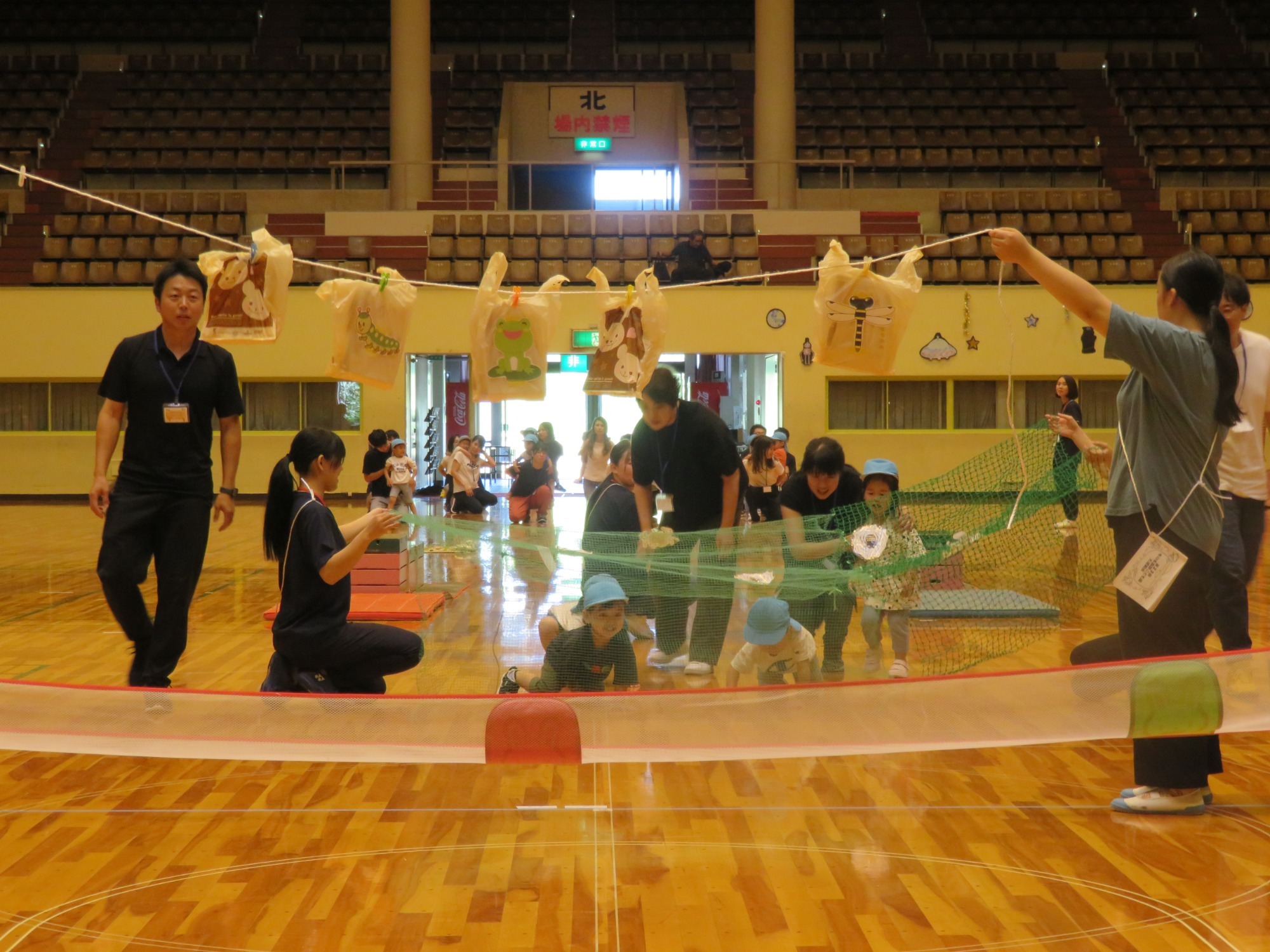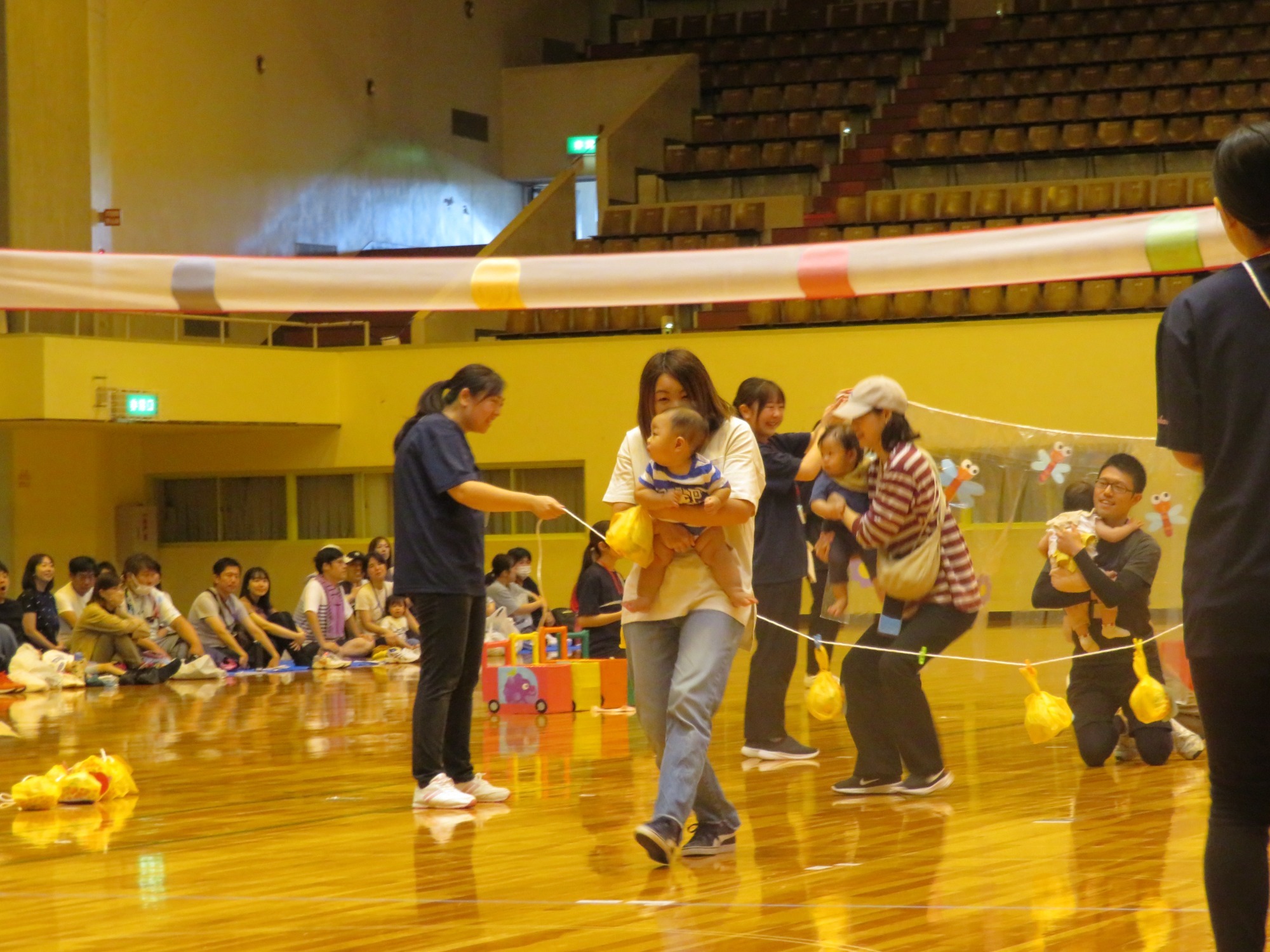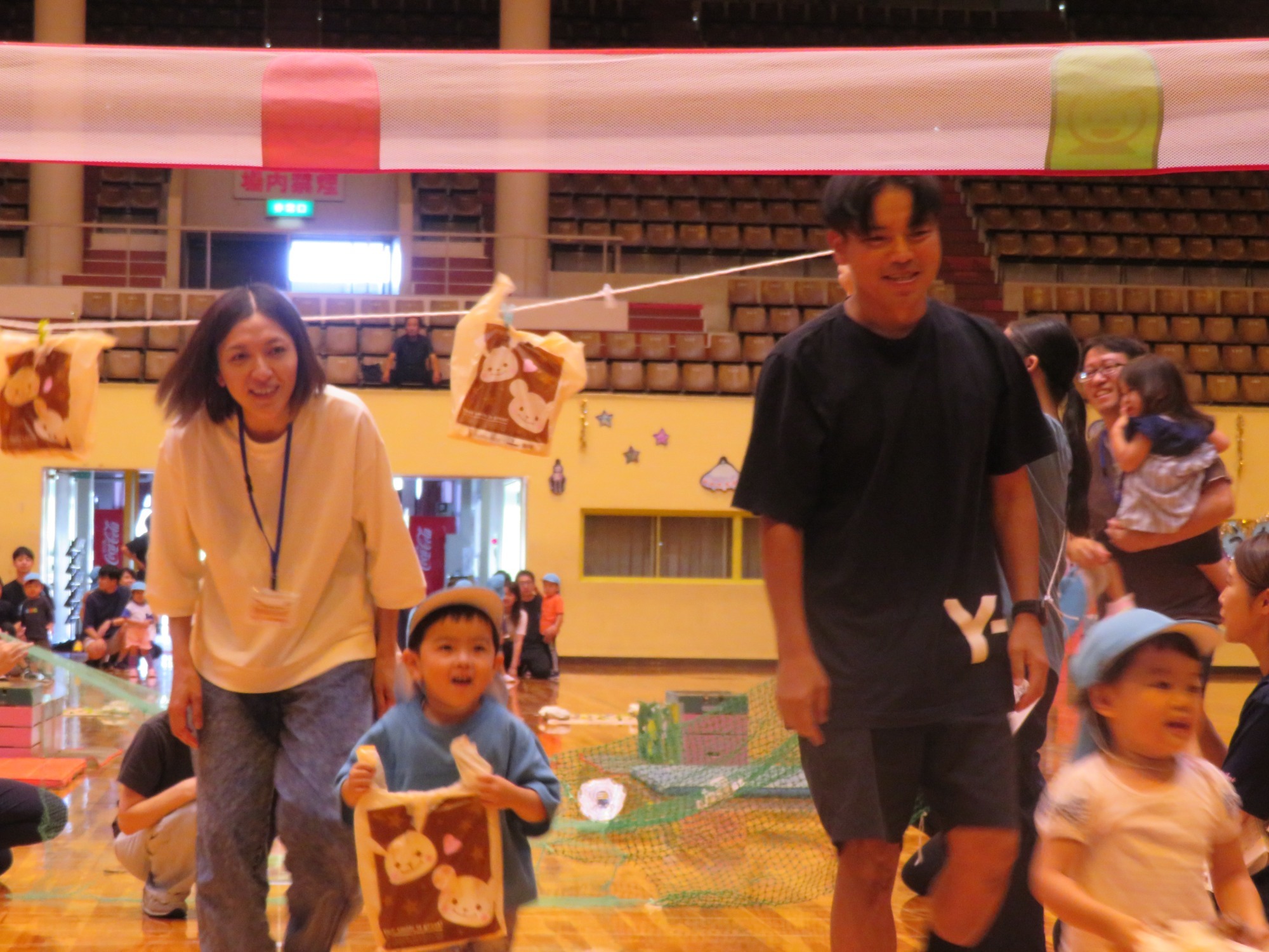 0歳児から2歳児の子どもたちは普段園で遊んでいる遊びをゲームにして親子のふれあいを楽しみながら、3歳児から5歳児の子どもたちは、かけっこやバルーン、和太鼓など元気いっぱいに披露します。もちろん、3歳児から5歳児クラスも親子でふれあい遊ぶ競技があります。我が子の育ちを感じながらたのしいひとときをみんなで一緒に過ごします。わが子の成長を肌で感じることができたのではないでしょうか。