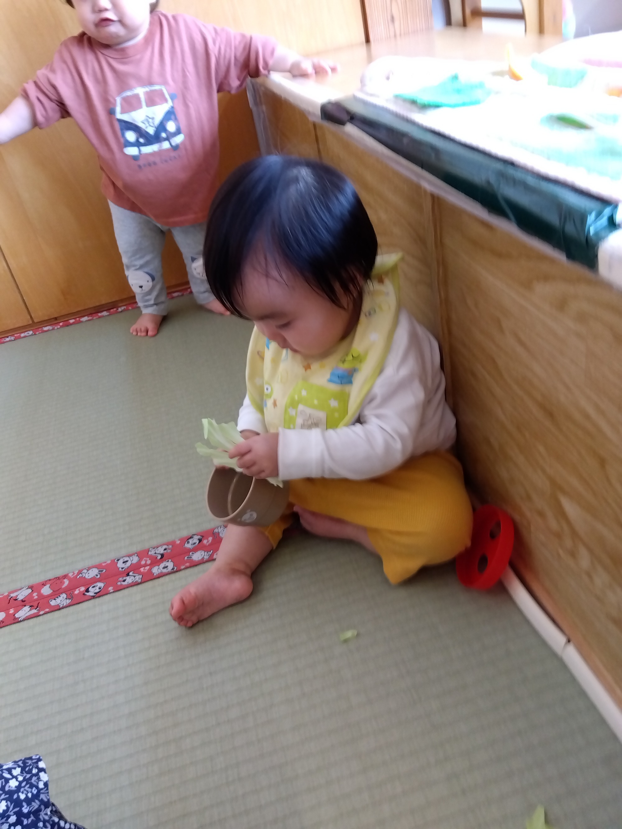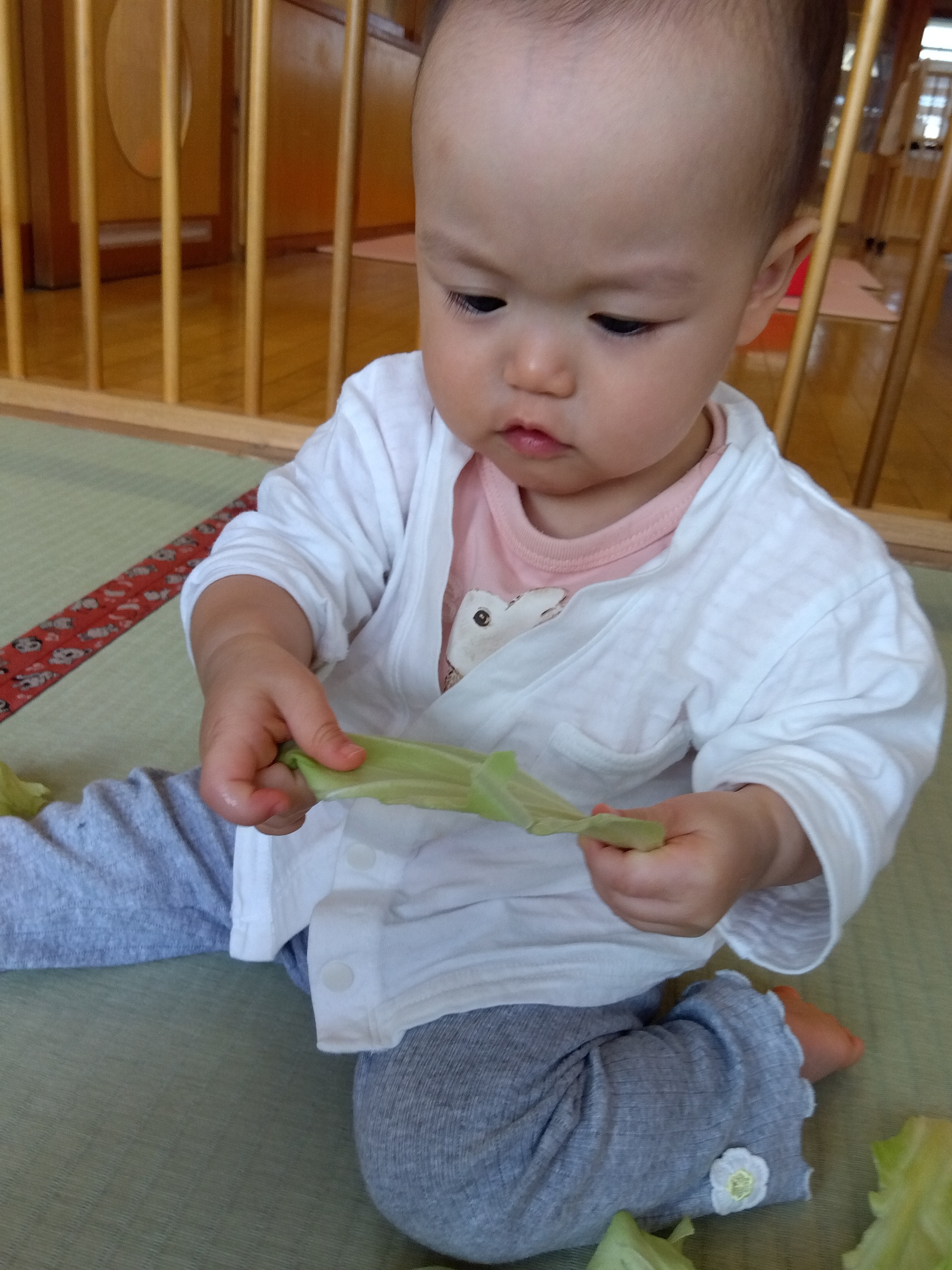 キャベツちぎり、玩具を使った遊び、寒天遊びをはじめ、手指をいっぱい使って全身で確かめます。