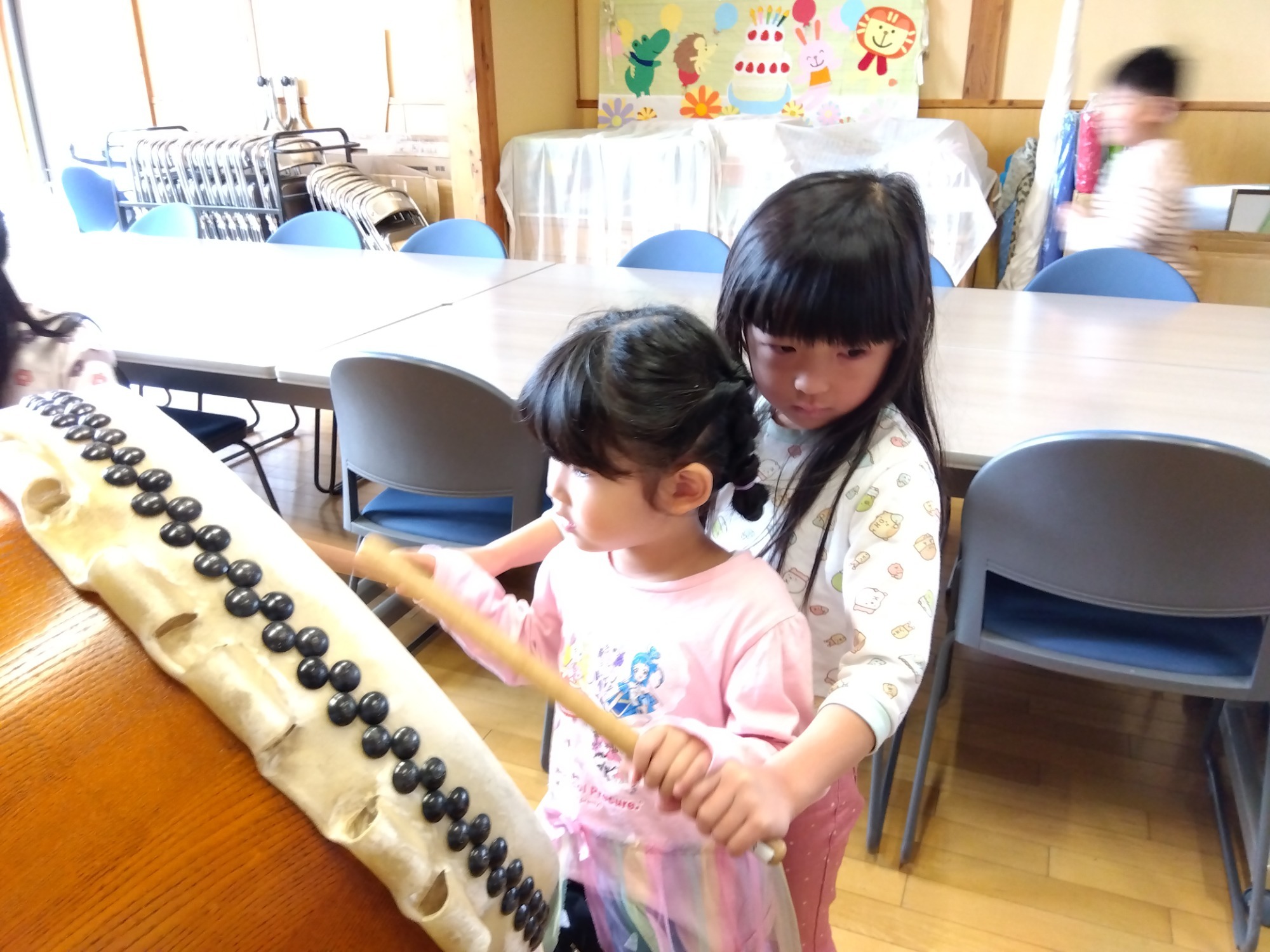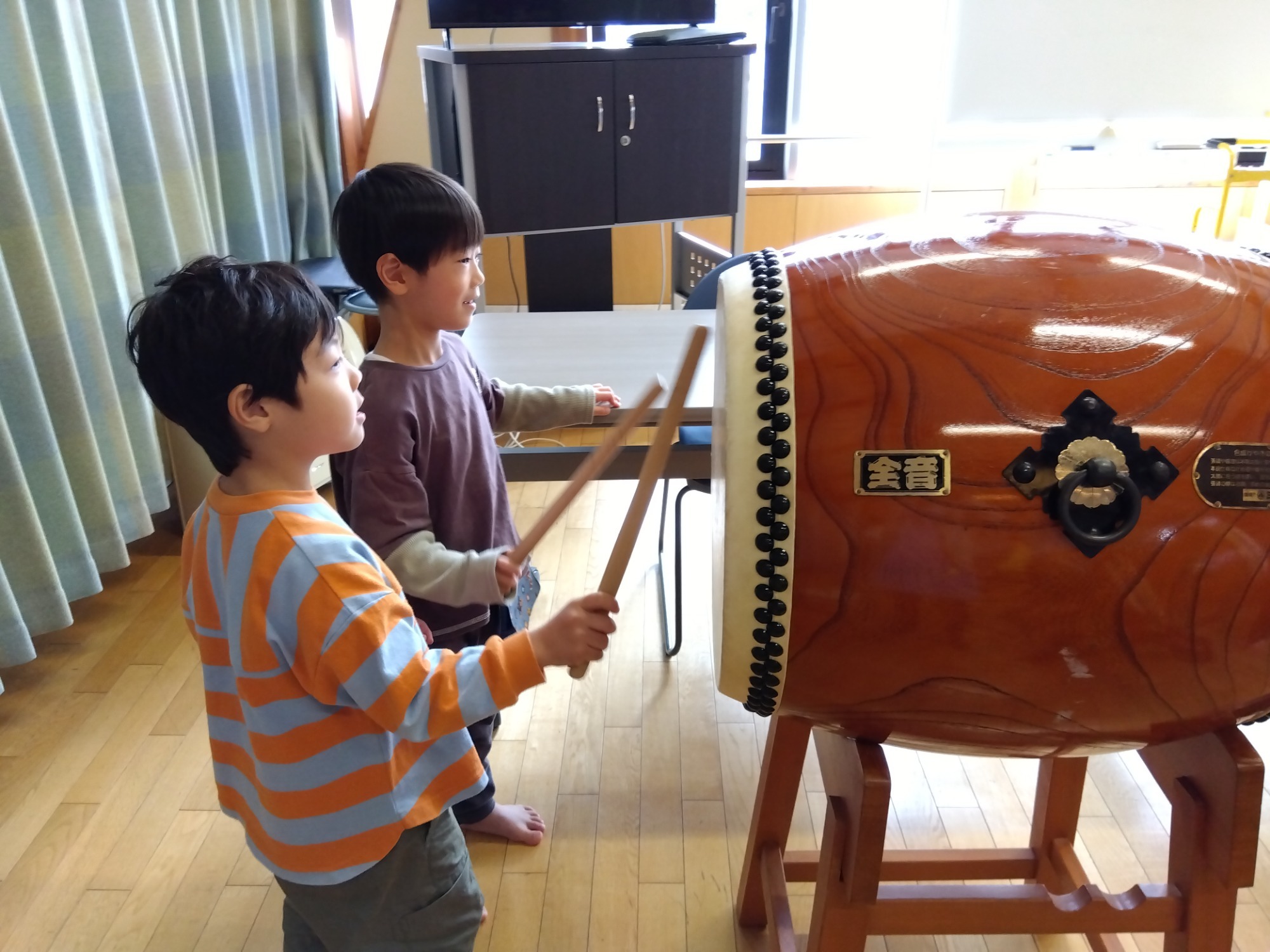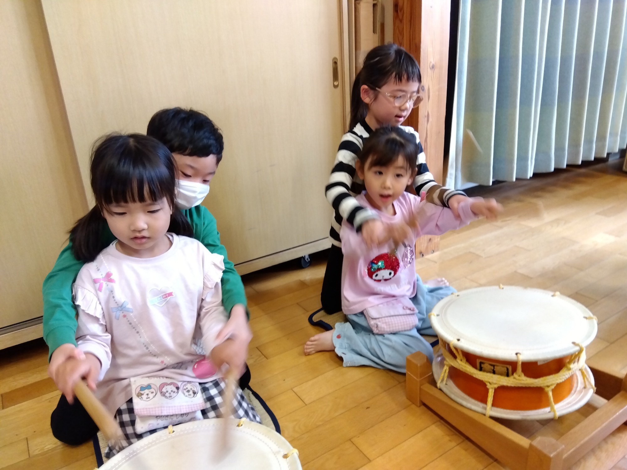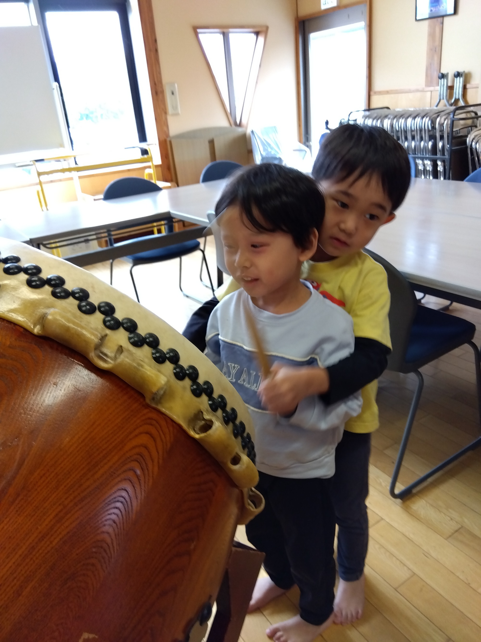 つき組の子どもたちは、いろんな和太鼓に触れ、たいようさんに手取り足取り伝授してもらいながら口唱和(太鼓のリズム)に親しんでいました。