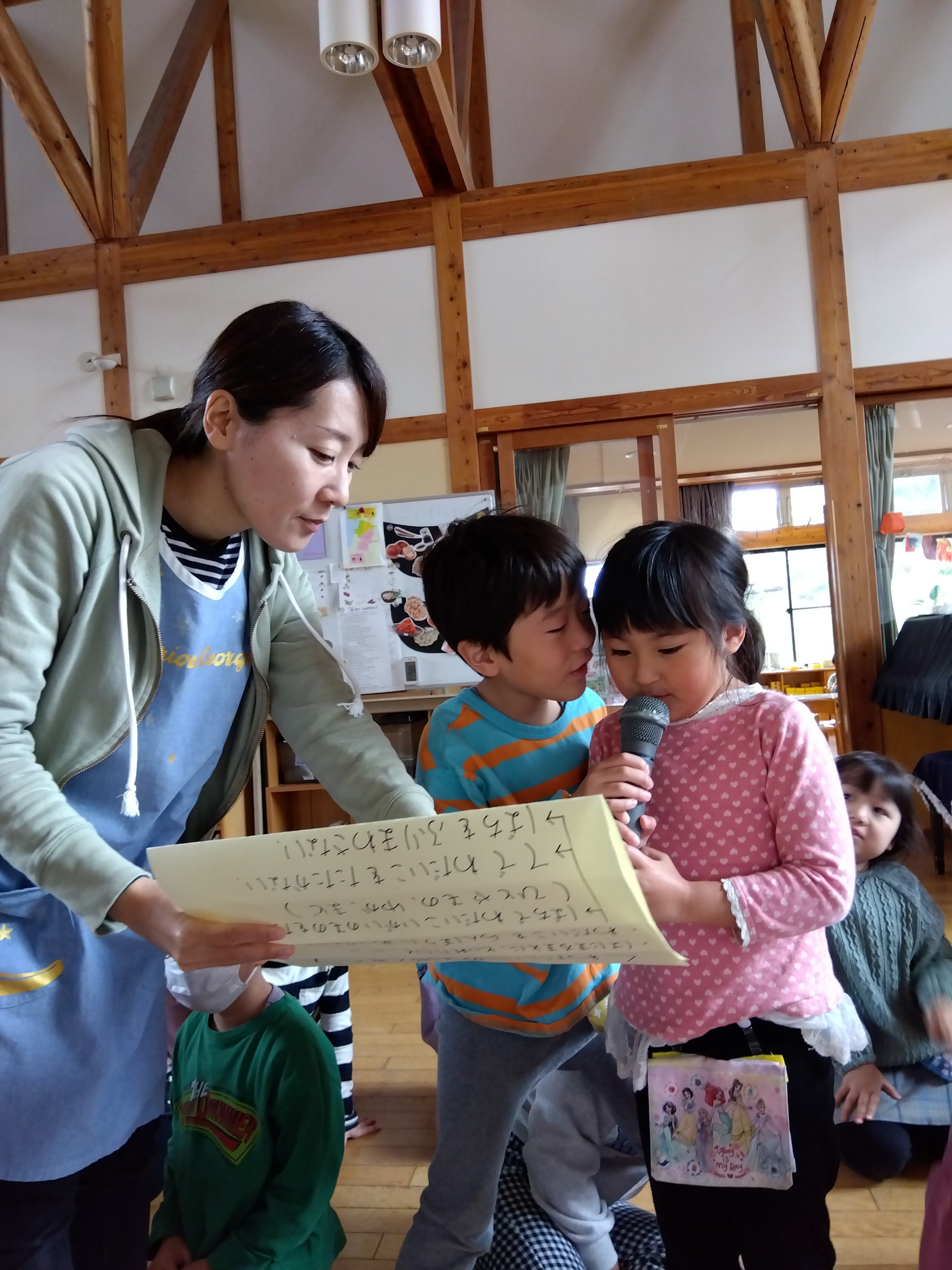 誕生会では七五三のお話しを園長先生から聞いて、園のみんなで大きくなったことを喜び合い、これからも元気に育つよう祈りながらお祝いしました。
