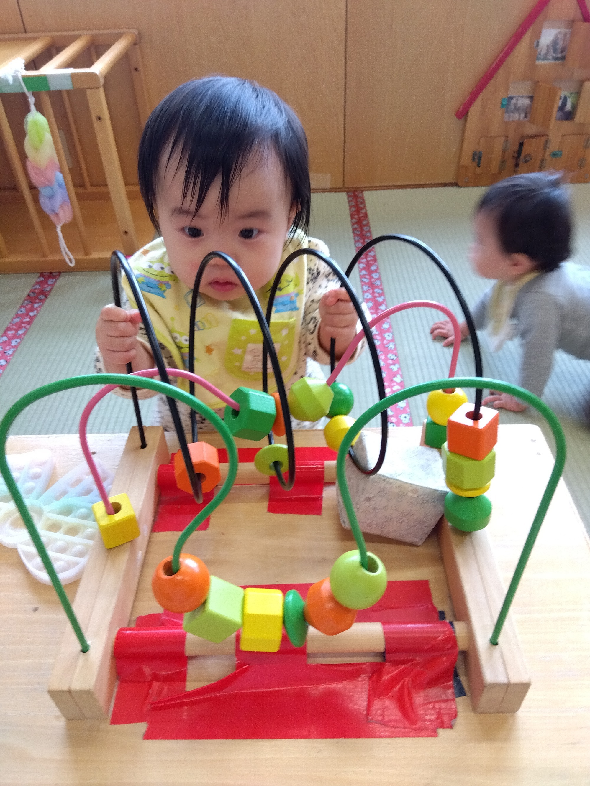 0歳児クラスほし組さんは、手や指先を使った遊びに夢中です。