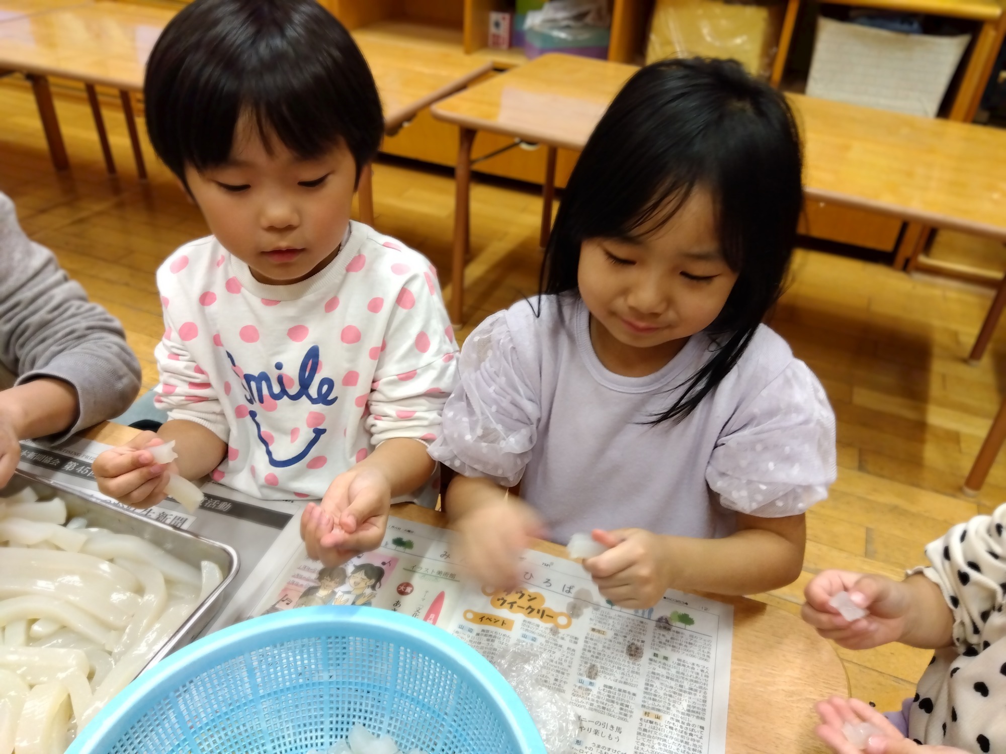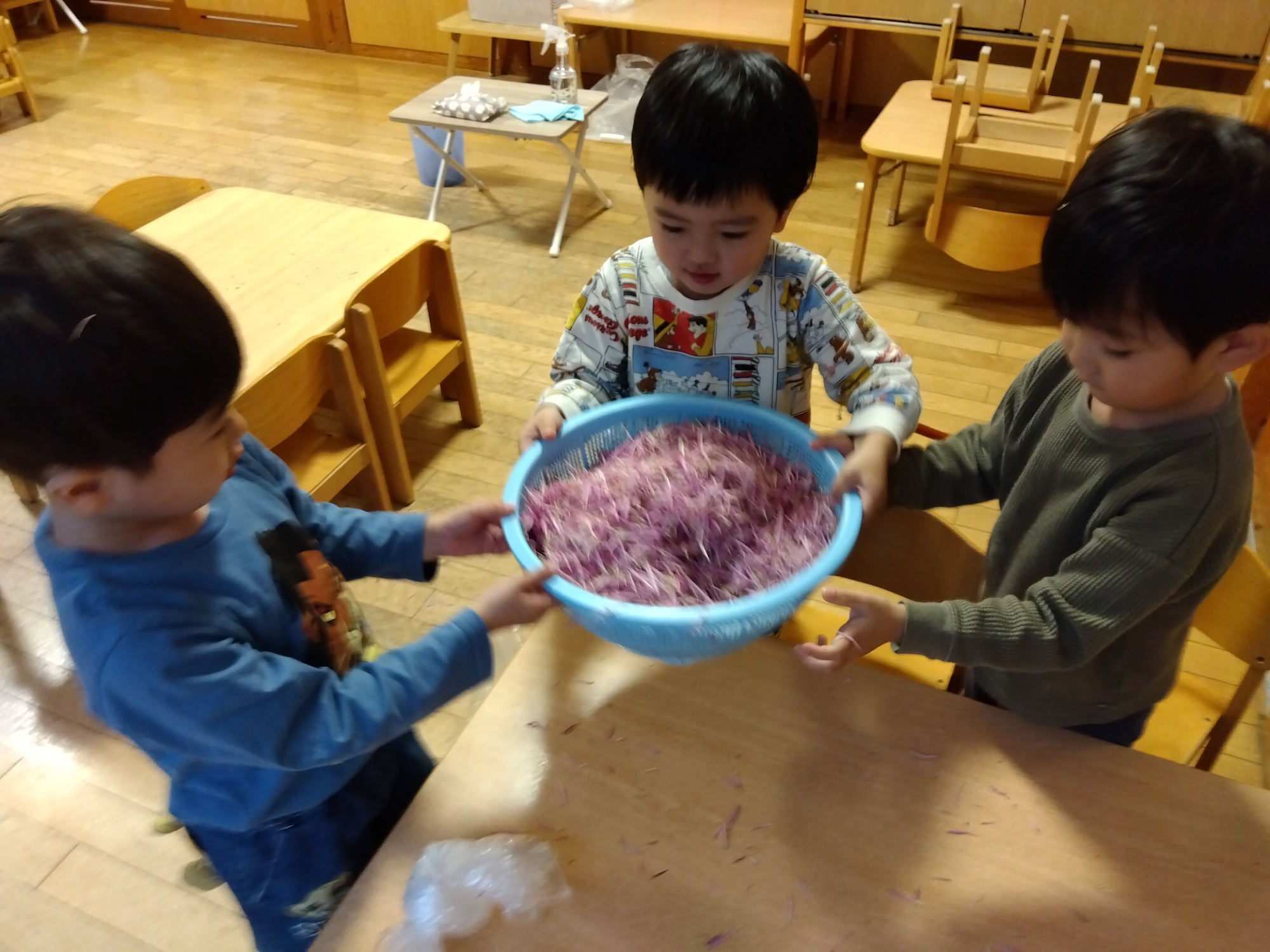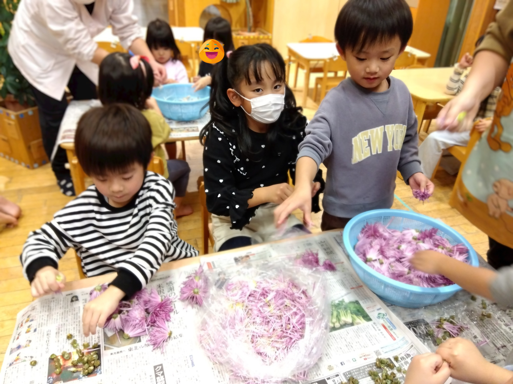 食用菊は山形ならではの食材。給食に使う菊の花の下準備を2歳児クラスひかり組のこどもたちがお手伝いしました。