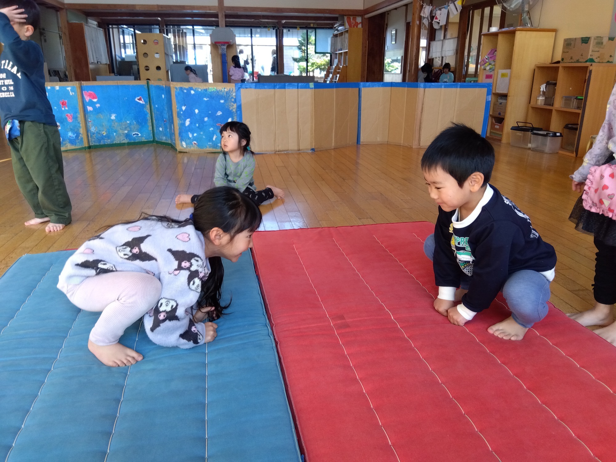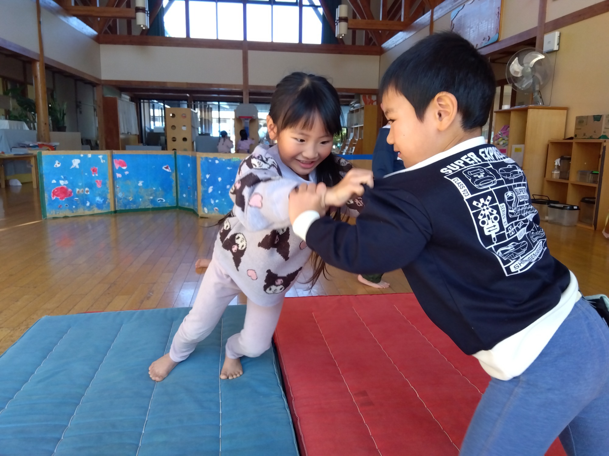 ある時のホールの様子、「すもうしよう!」と子ども達。真剣に遊ぶ中で、相手と対等に力比べをしたり、小さい子相手に少しだけ加減したり、人との関わりを学んでいる真っ最中です。