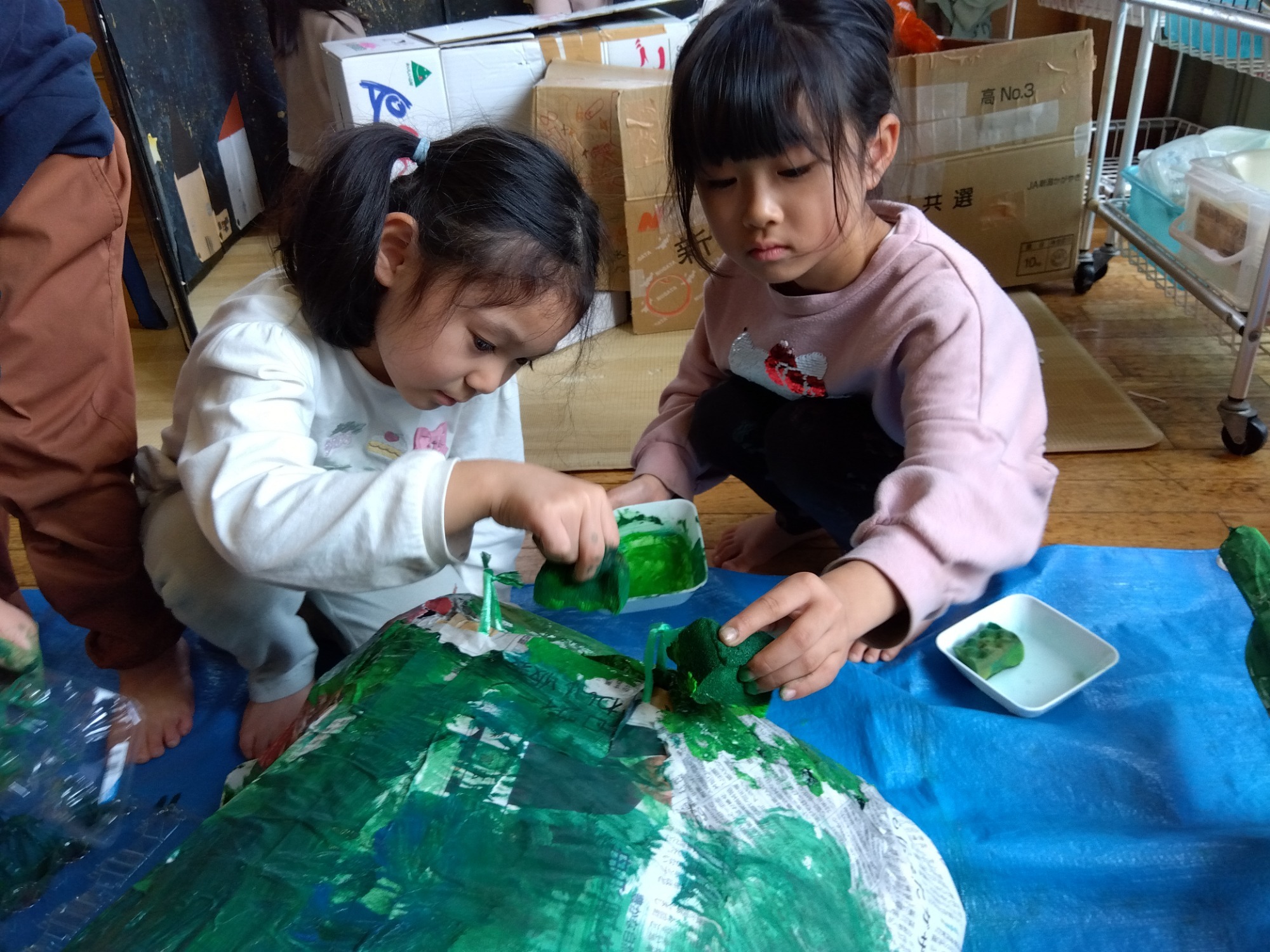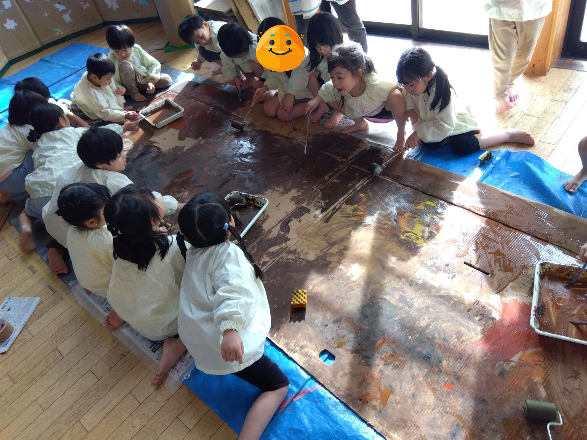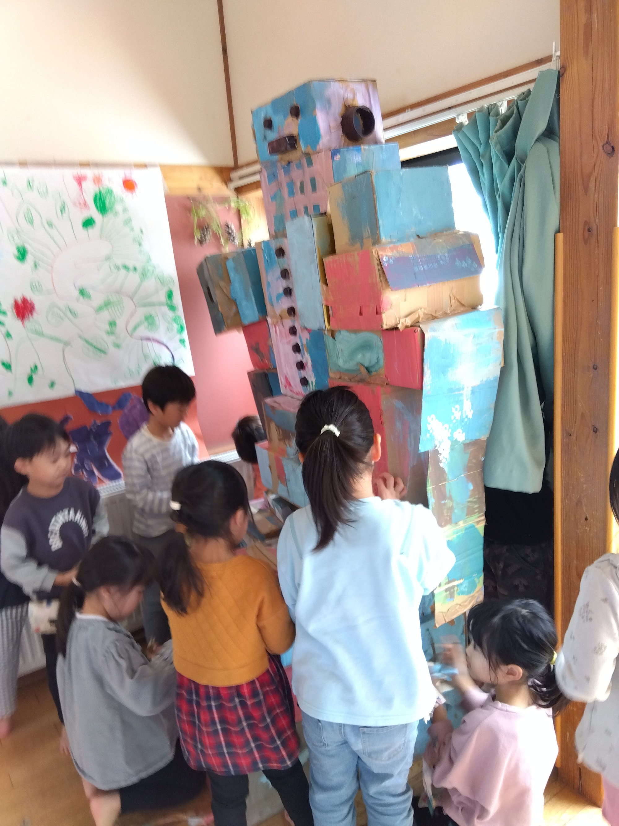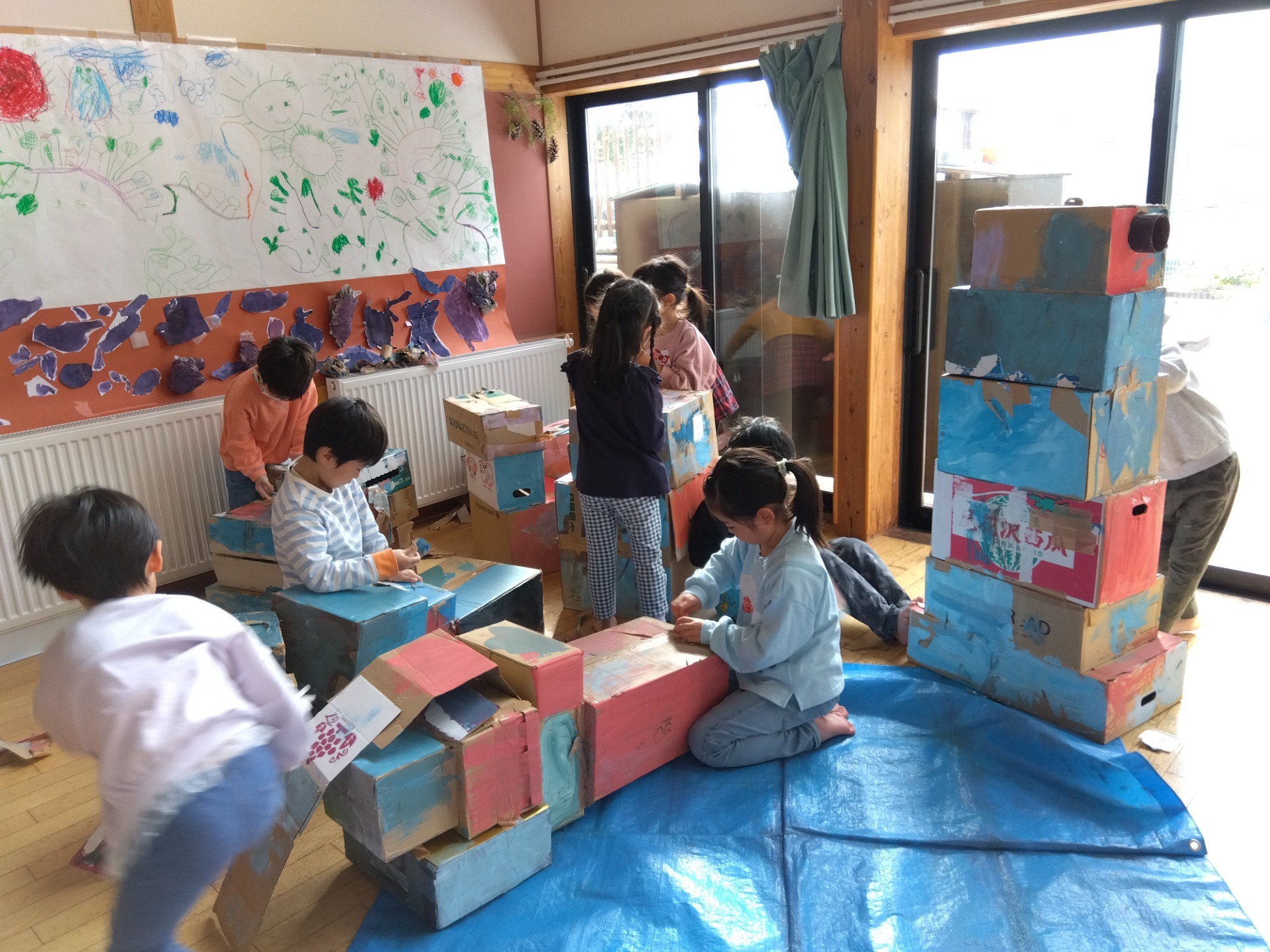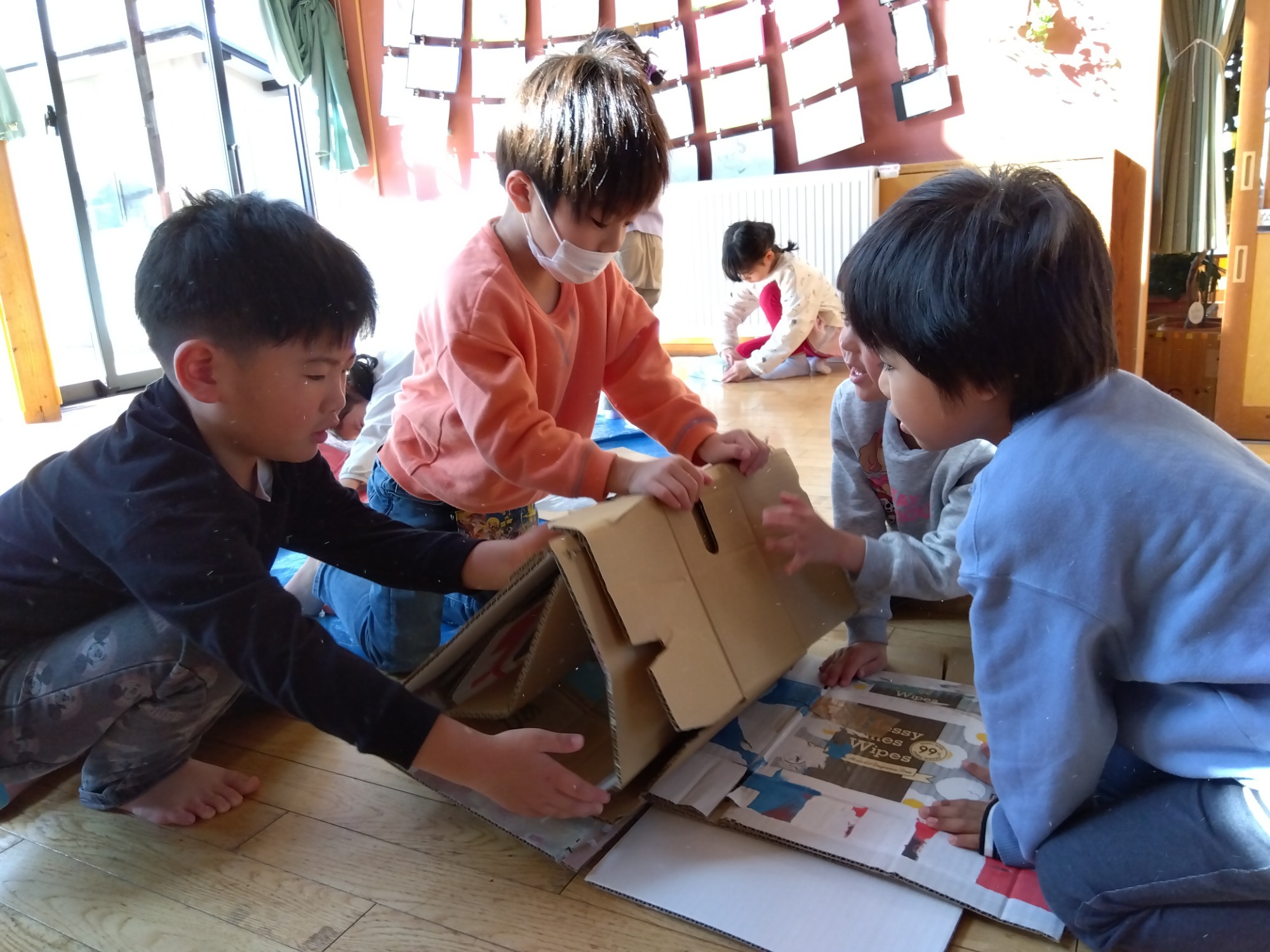 つき組も劇遊びの中で使う『おうち』をどうしようか、みんなでイメージを出し合って製作が始まりました。