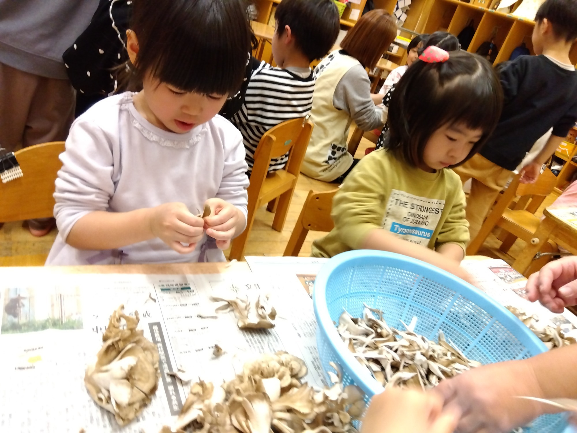 つまんだりちぎったりしながら「これは、なんだろうな?」「おもしろいな」「きもちいいな(または)きもちわるいな」「ふしぎだな」などなどいろんな思い・感覚を遊びの中で味わいます。
