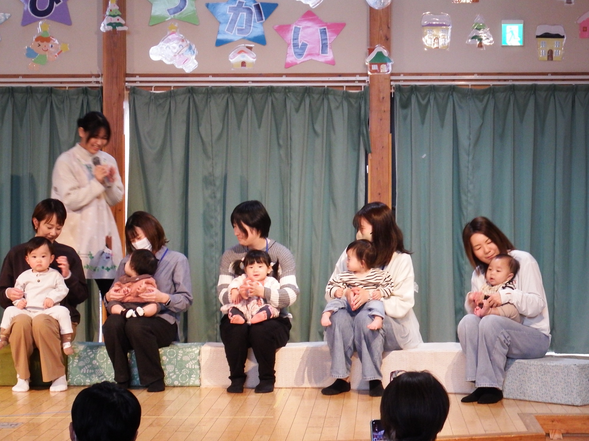 ほし組さんは、お父さんお母さんと一緒にステージにあがり、可愛らしいしぐさや表情を見せていました。
