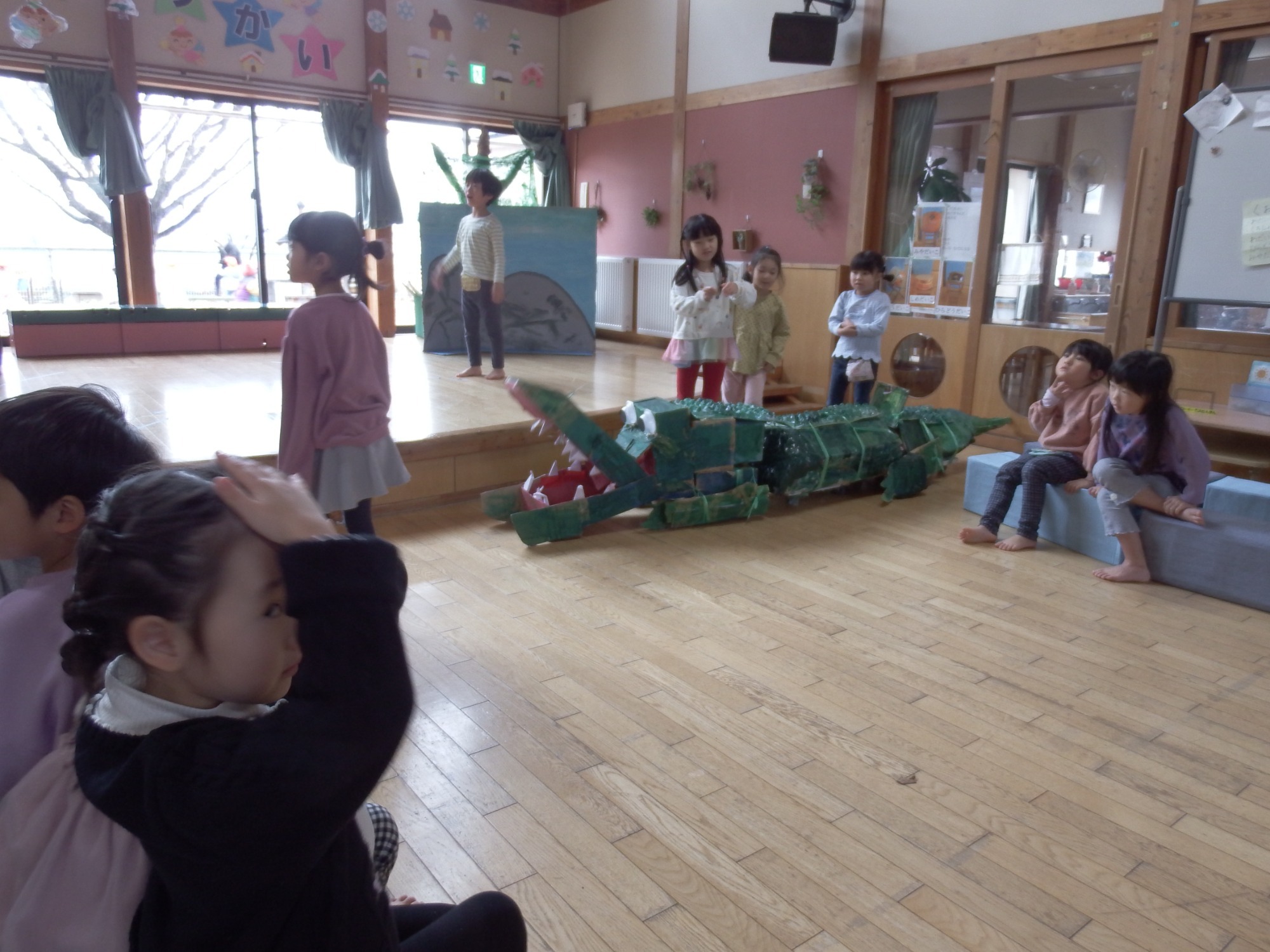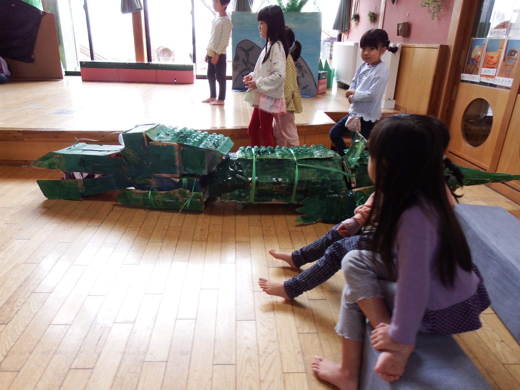 今、みんなが好きなお話しを劇にして遊んでいて、劇の中で使うものに変身させようということになりました。