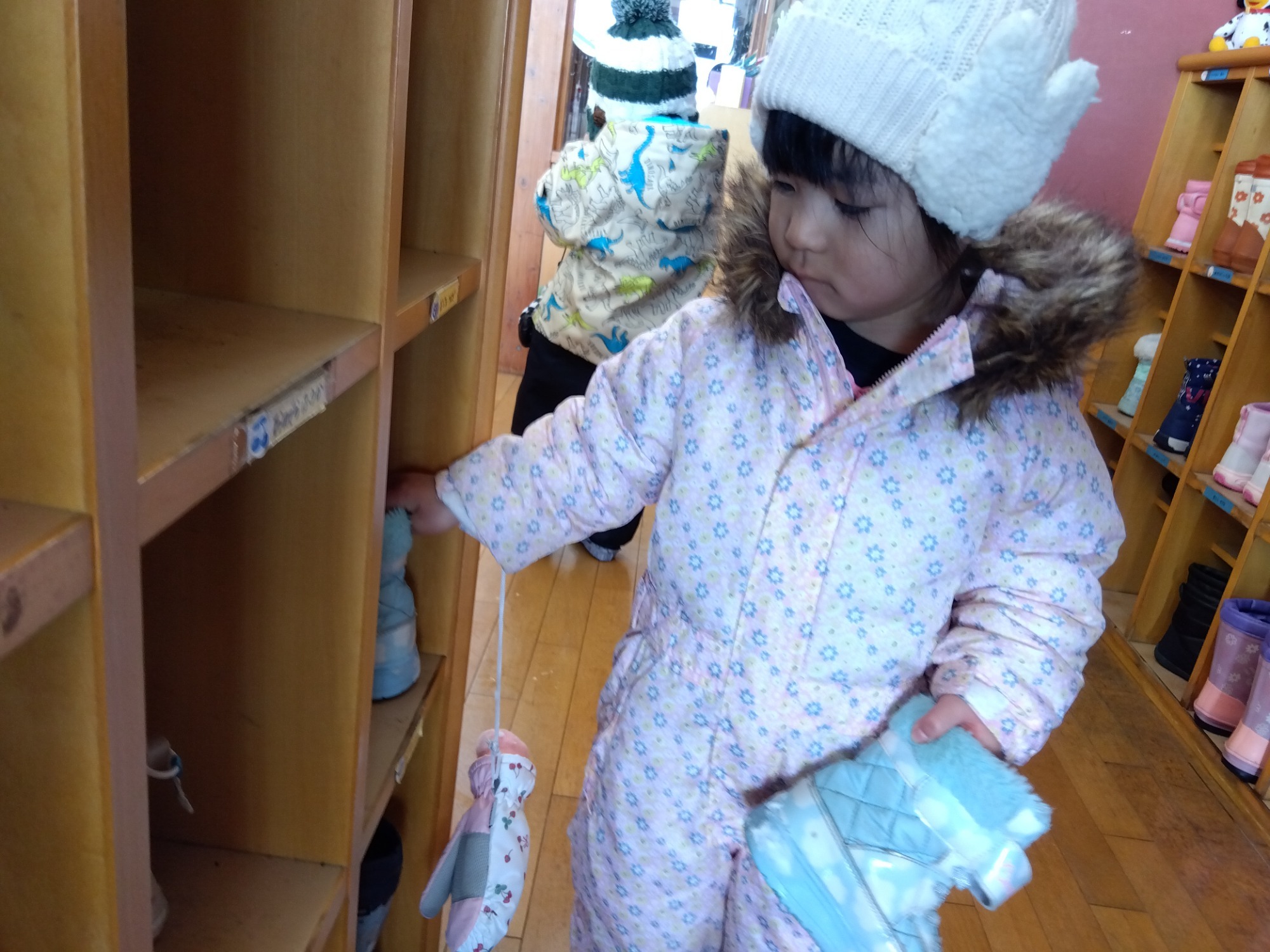 散歩に行こうか、雪遊びをしようか…と支度を始めると、自分の靴下やスキーウェアをもってきて「着せて」と言うように保育者に差し出します。