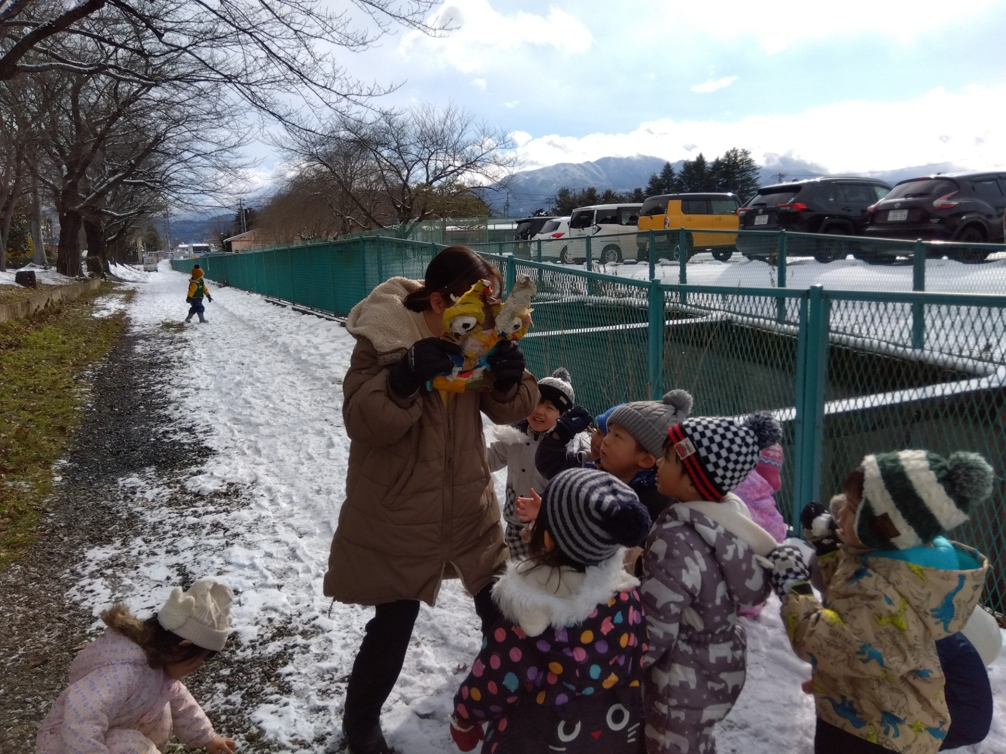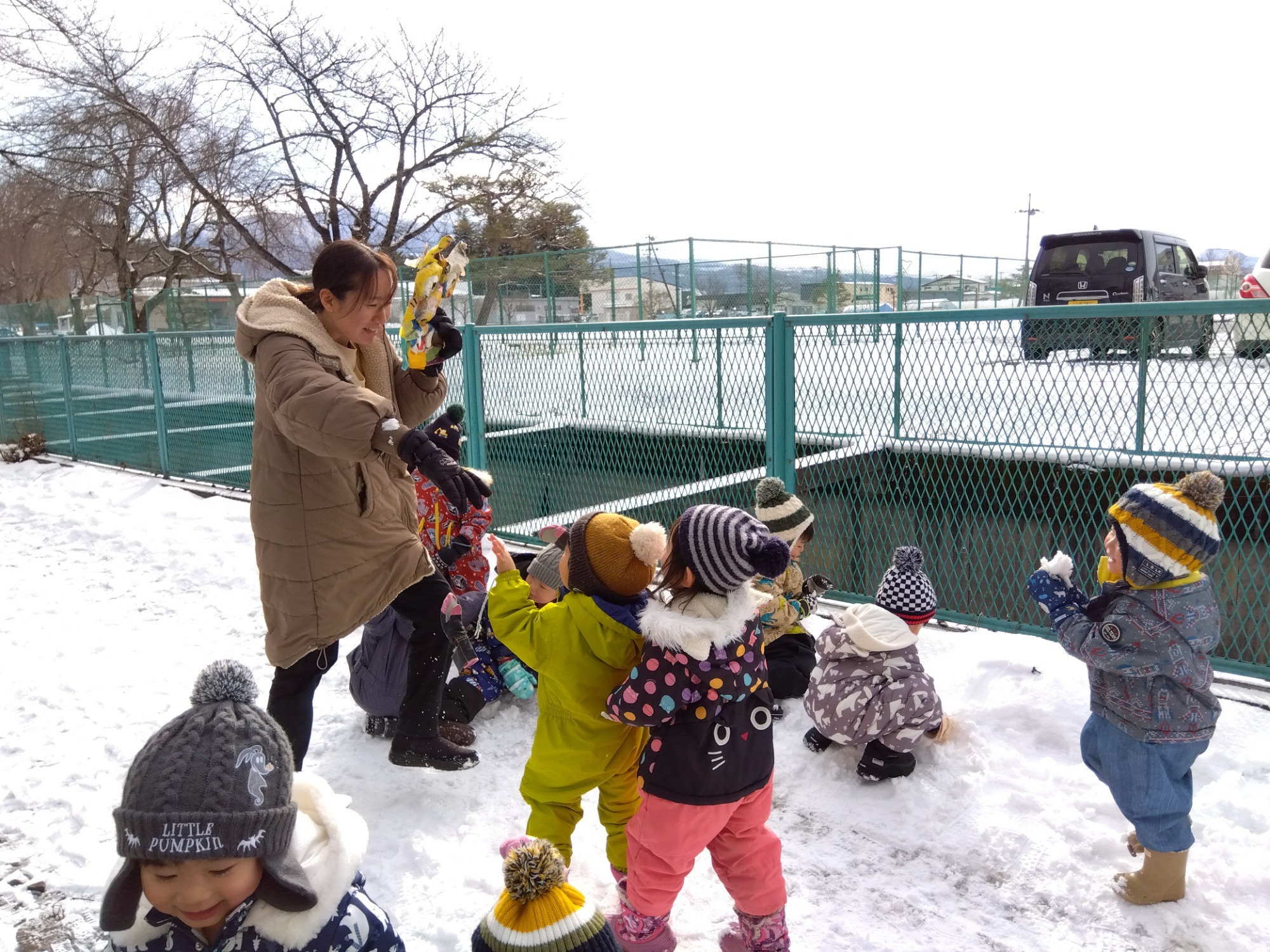 オニが来たら豆をまくよね・・・ということで、保育者をオニに、雪をオニが苦手な豆にみたててオニ退治をして遊んだひかり組さんです。