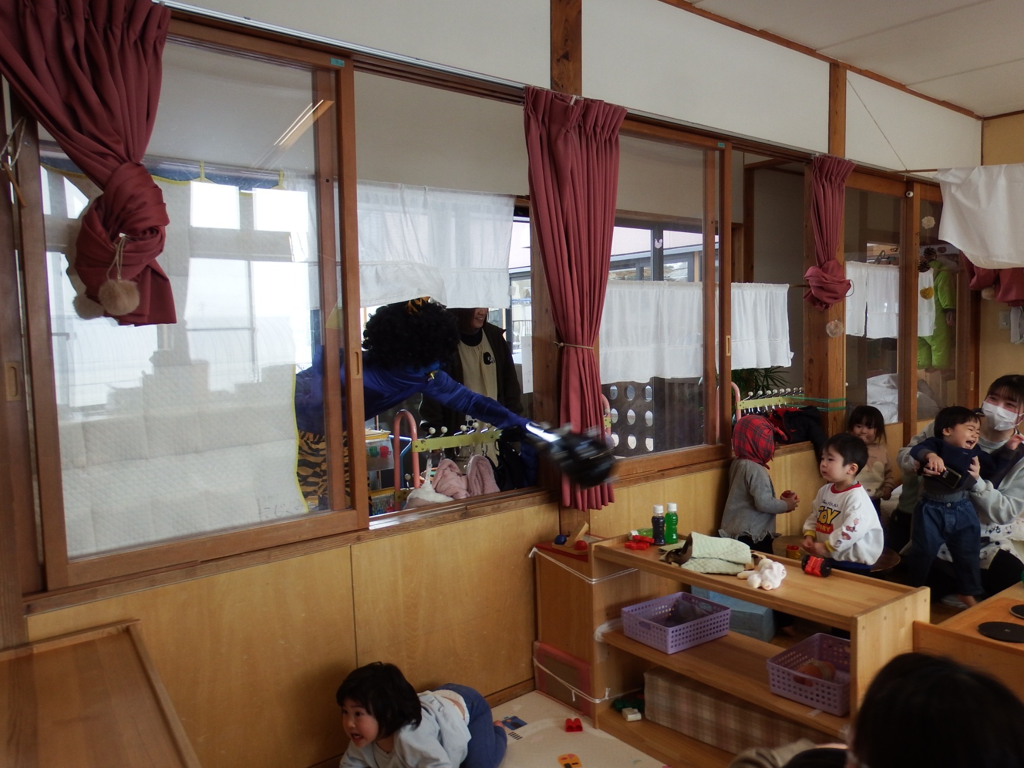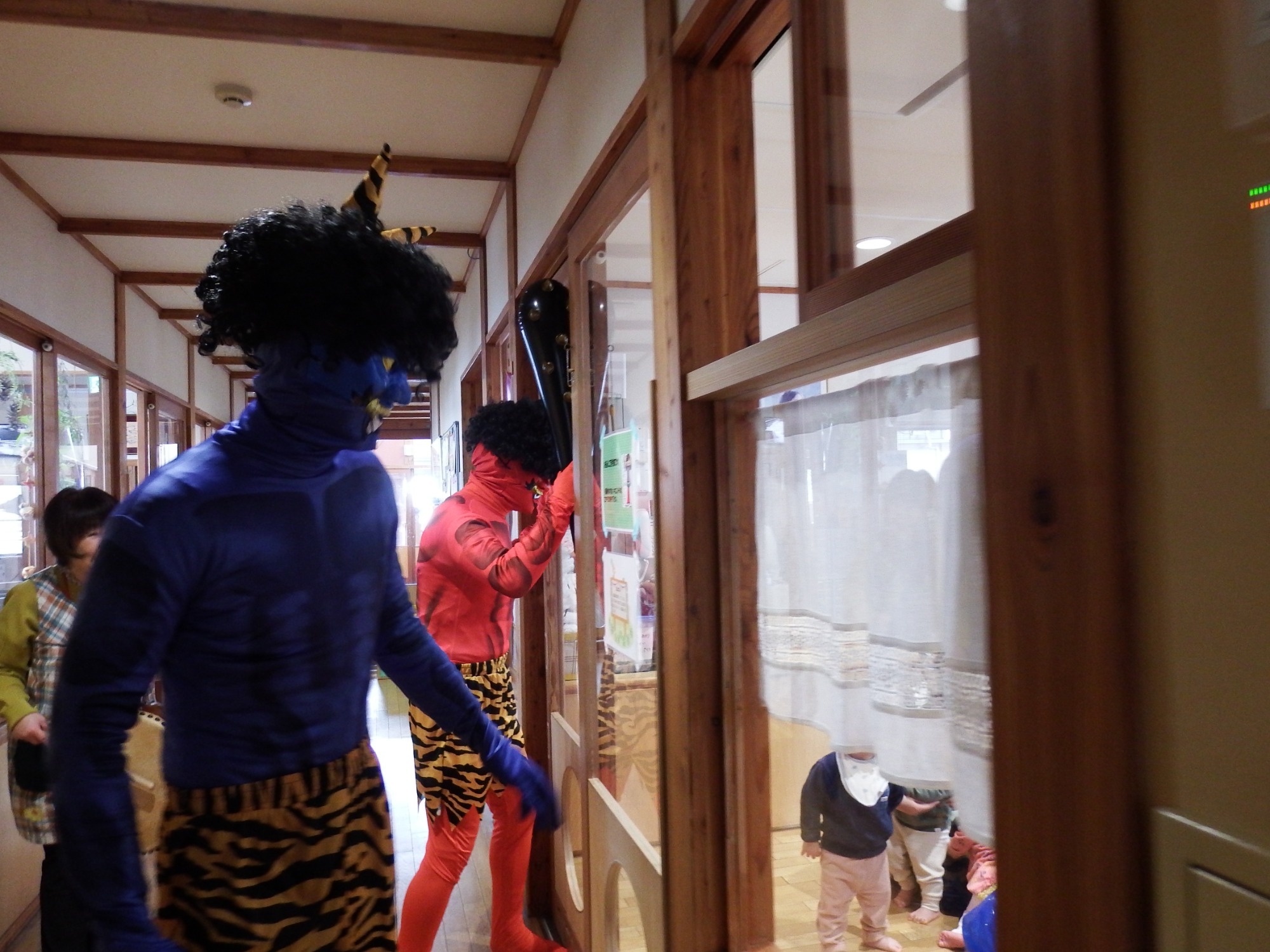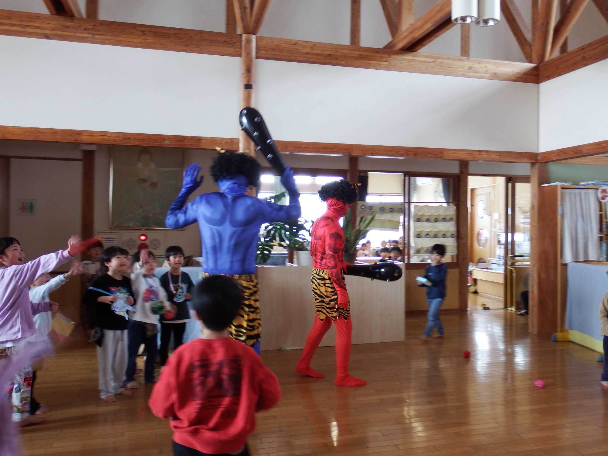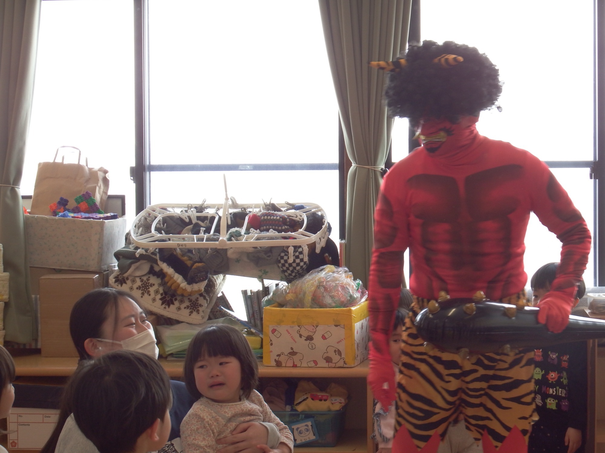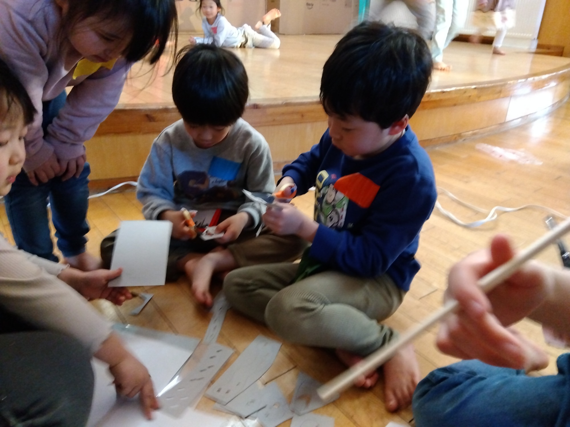 節分の朝、「鬼、くる?」「鬼から知らせがあった?」とドキドキした表情で聞いてくる子が数人、そうかと思えば「作戦、ばっちりだから大丈夫!」「みんなで豆投げれば鬼は逃げていくんだよ」と言う子もいます。「こわい」というそら組さんの中には「なかよしグループのたいようさんに守ってもらうんだ!」と年長さんを心強く思っている子もいました。