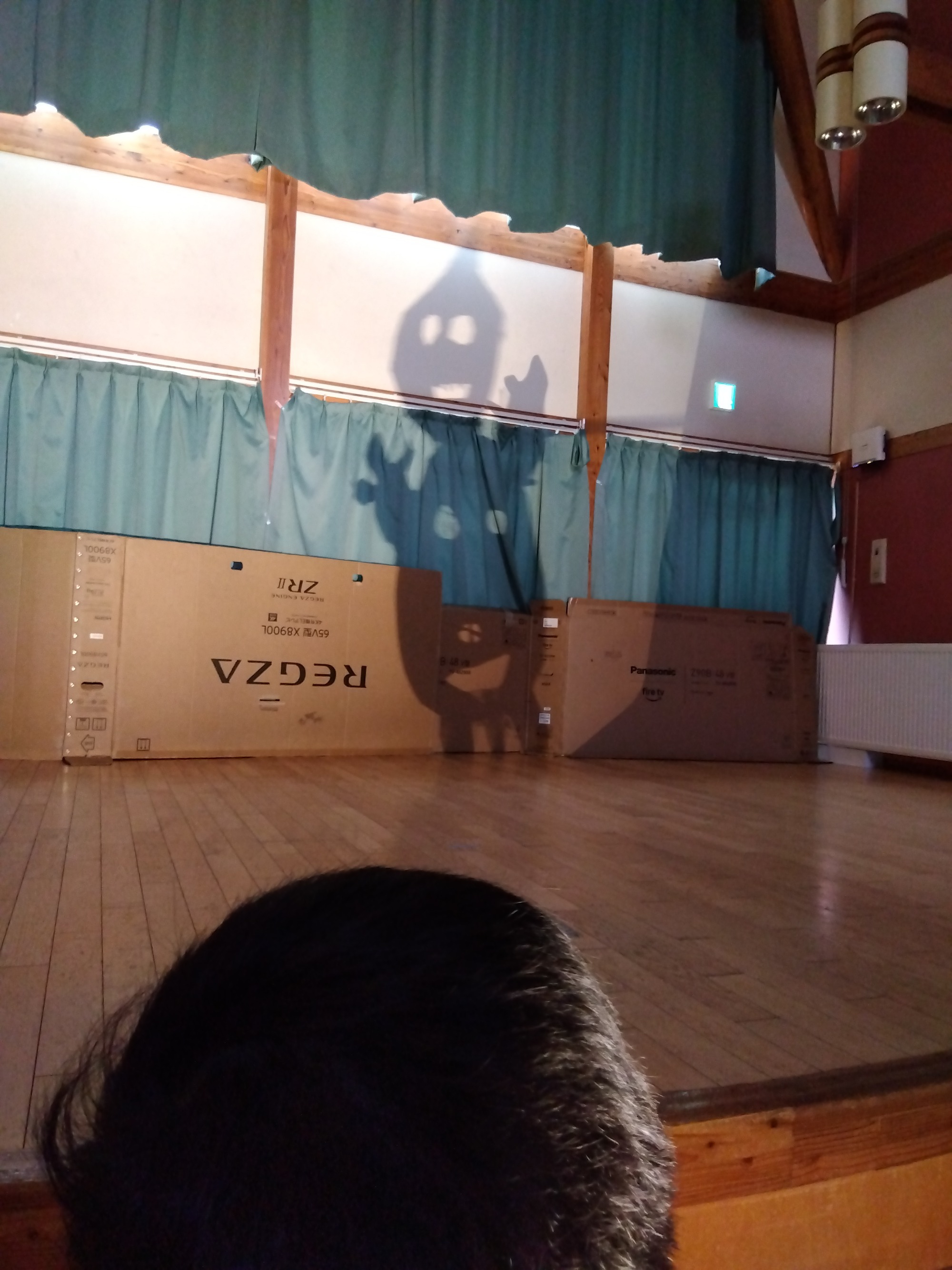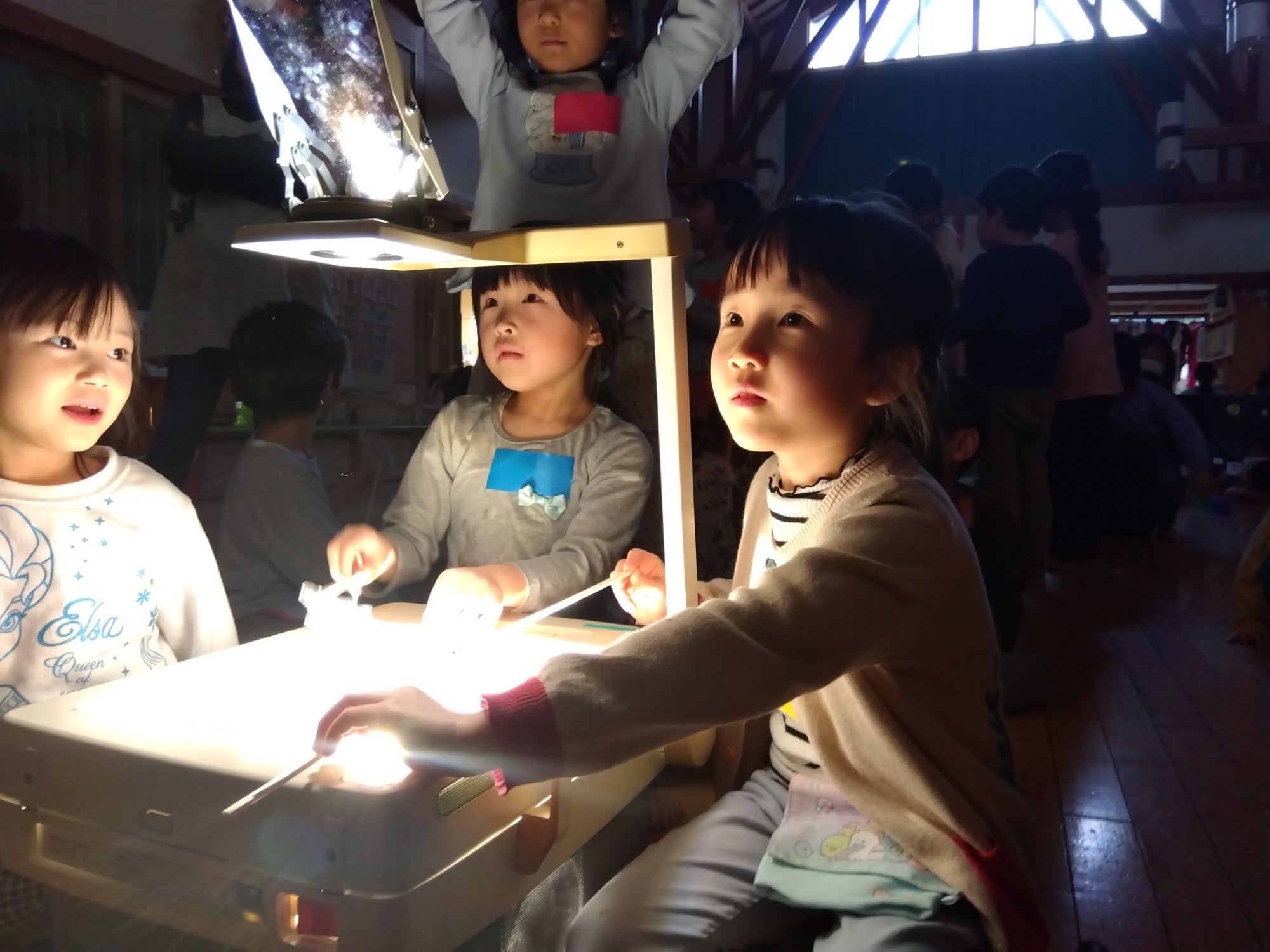 たいよう組の子ども達はおばけをテーマにつくったペープサートやセロファンをOHPで壁に映し出し、自分で操作しながら色や大きさを楽しみました。