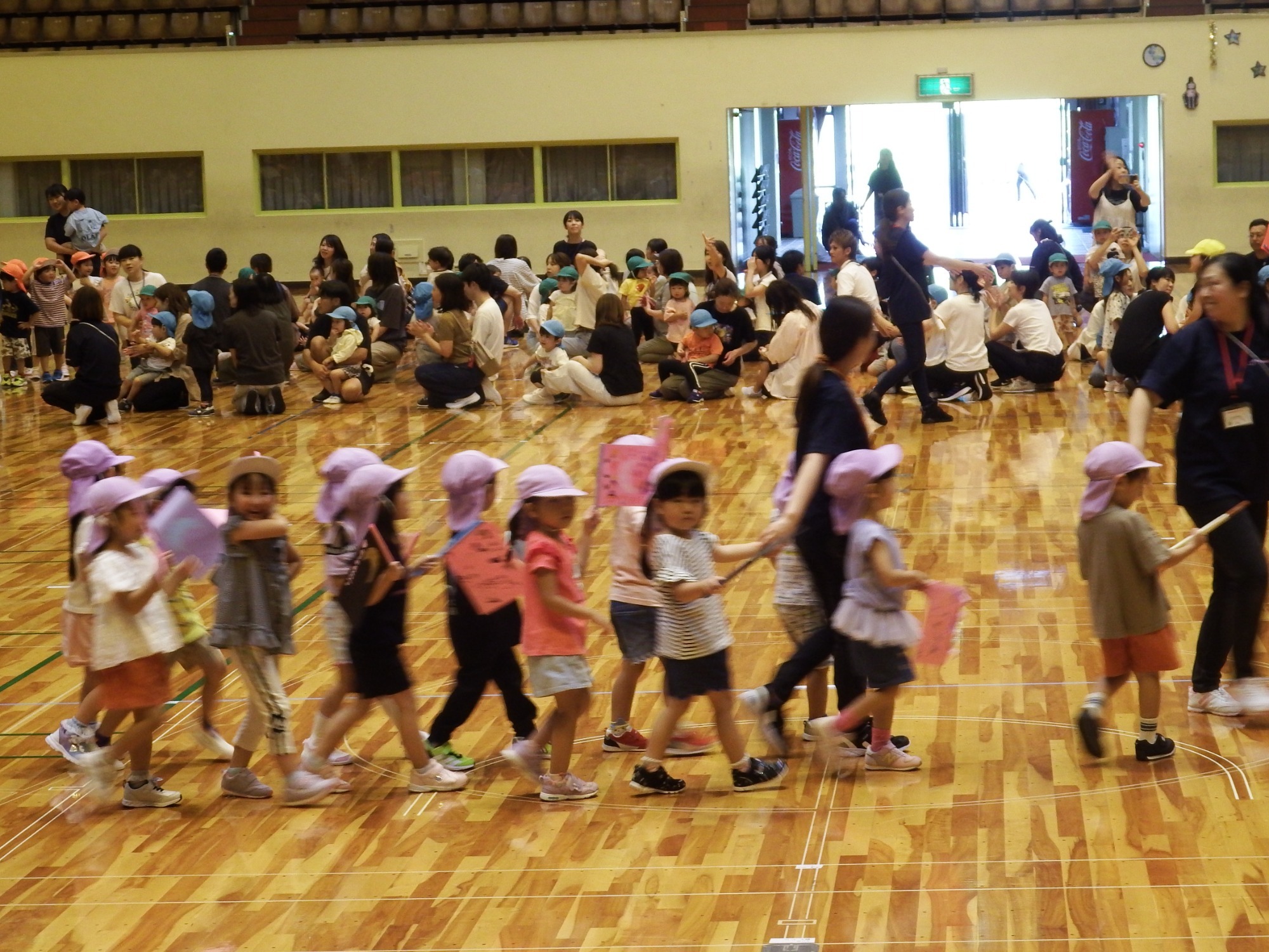 以上児クラスの入場は、たいよう組の横断幕を先頭に、手を振ったり手作り旗を振ったり思い思いのスタイルで登場しました。