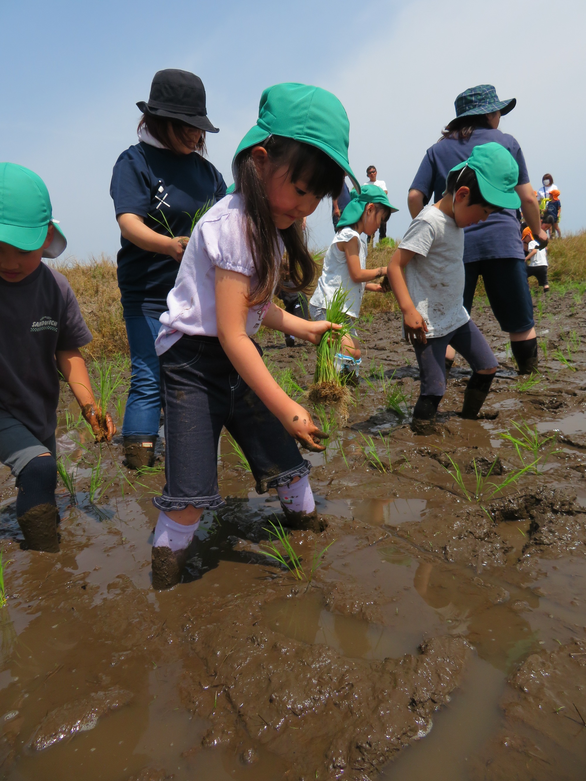泥の感触を存分に味わい、しりもちをついたり顔に泥はねがついたり、全身泥んこまみれになって楽しみました。秋の収穫が楽しみです。