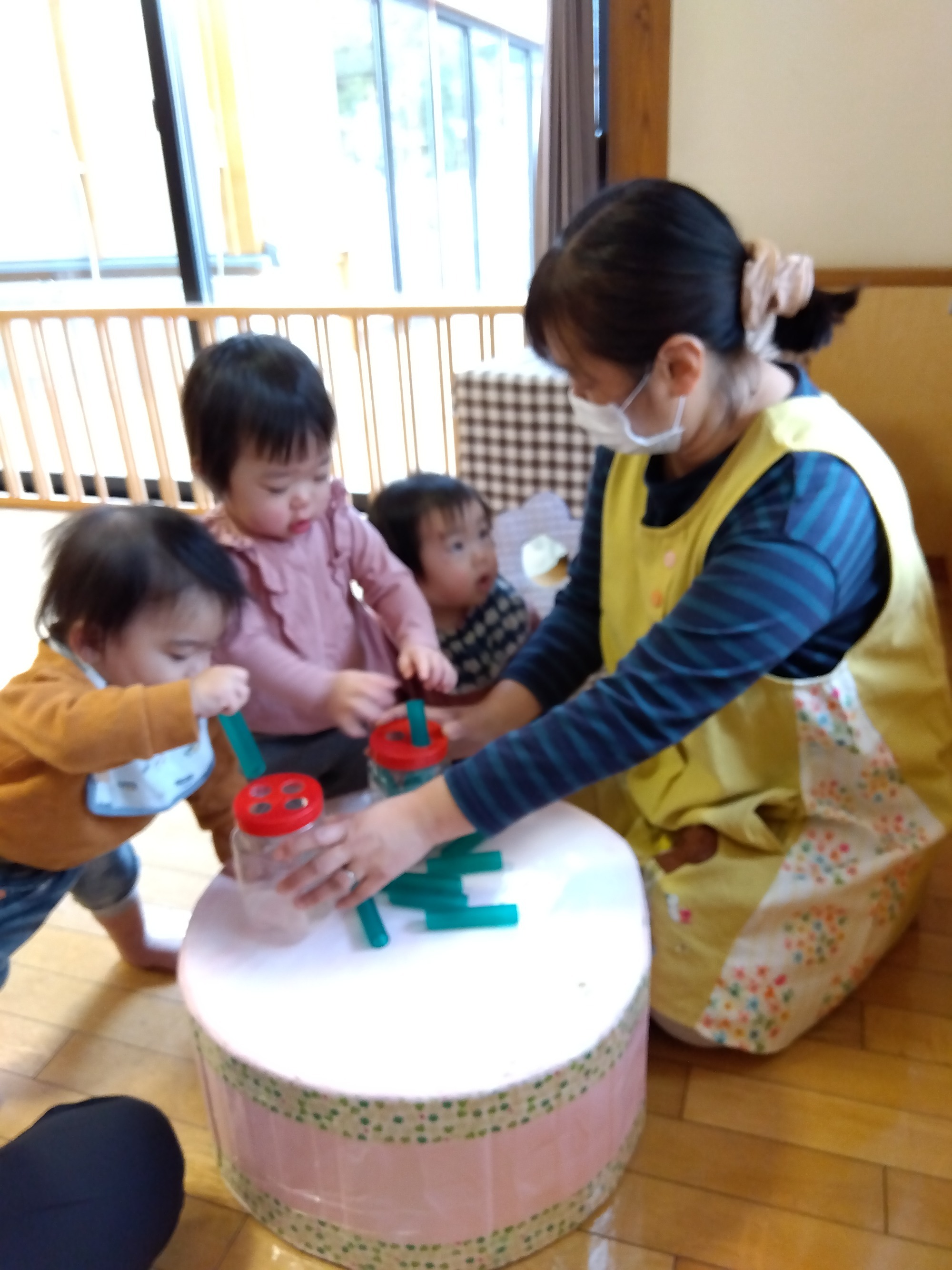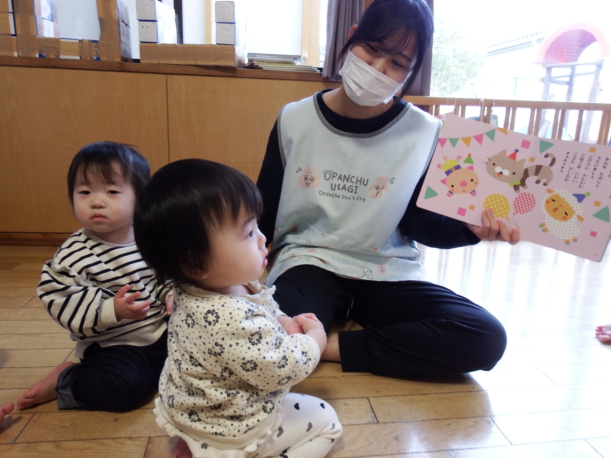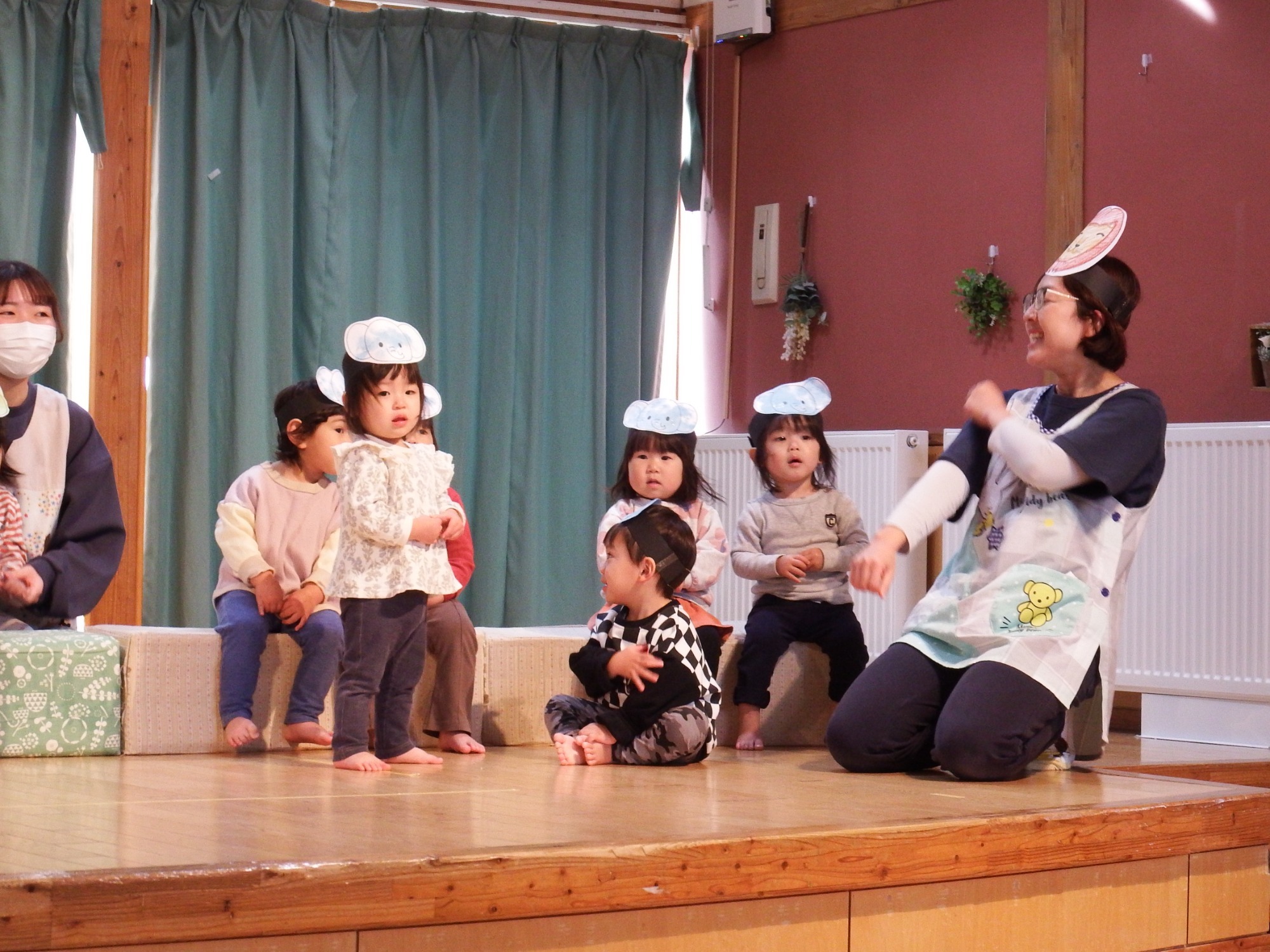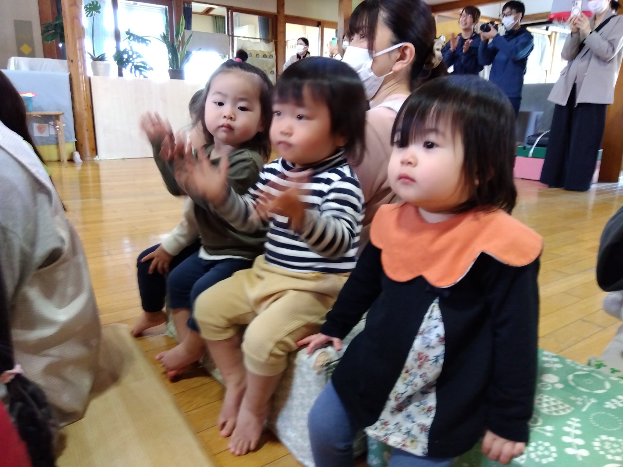 0歳児クラスほし組の1歳半くらいのお友だちも誕生会に参加してみました。