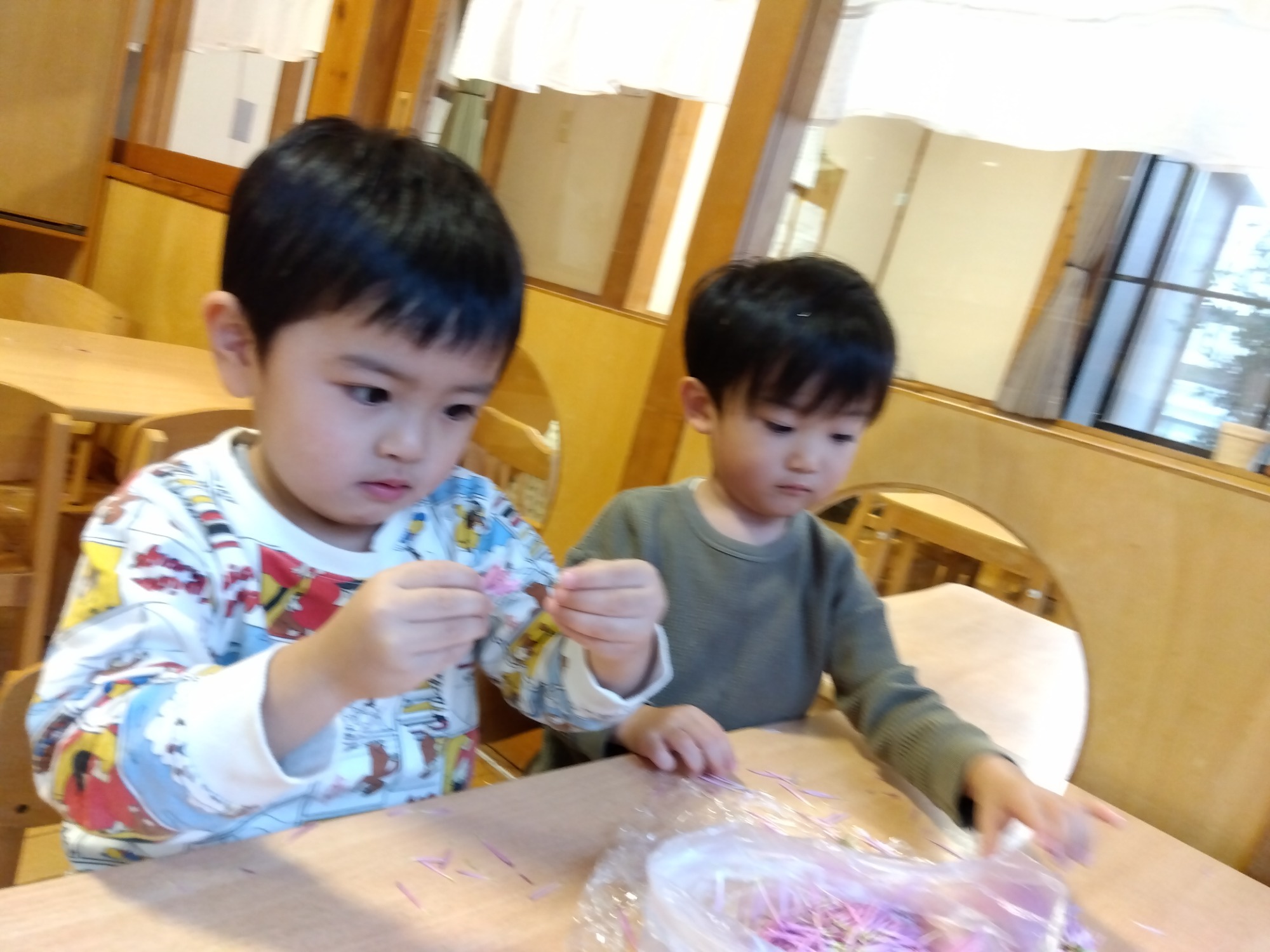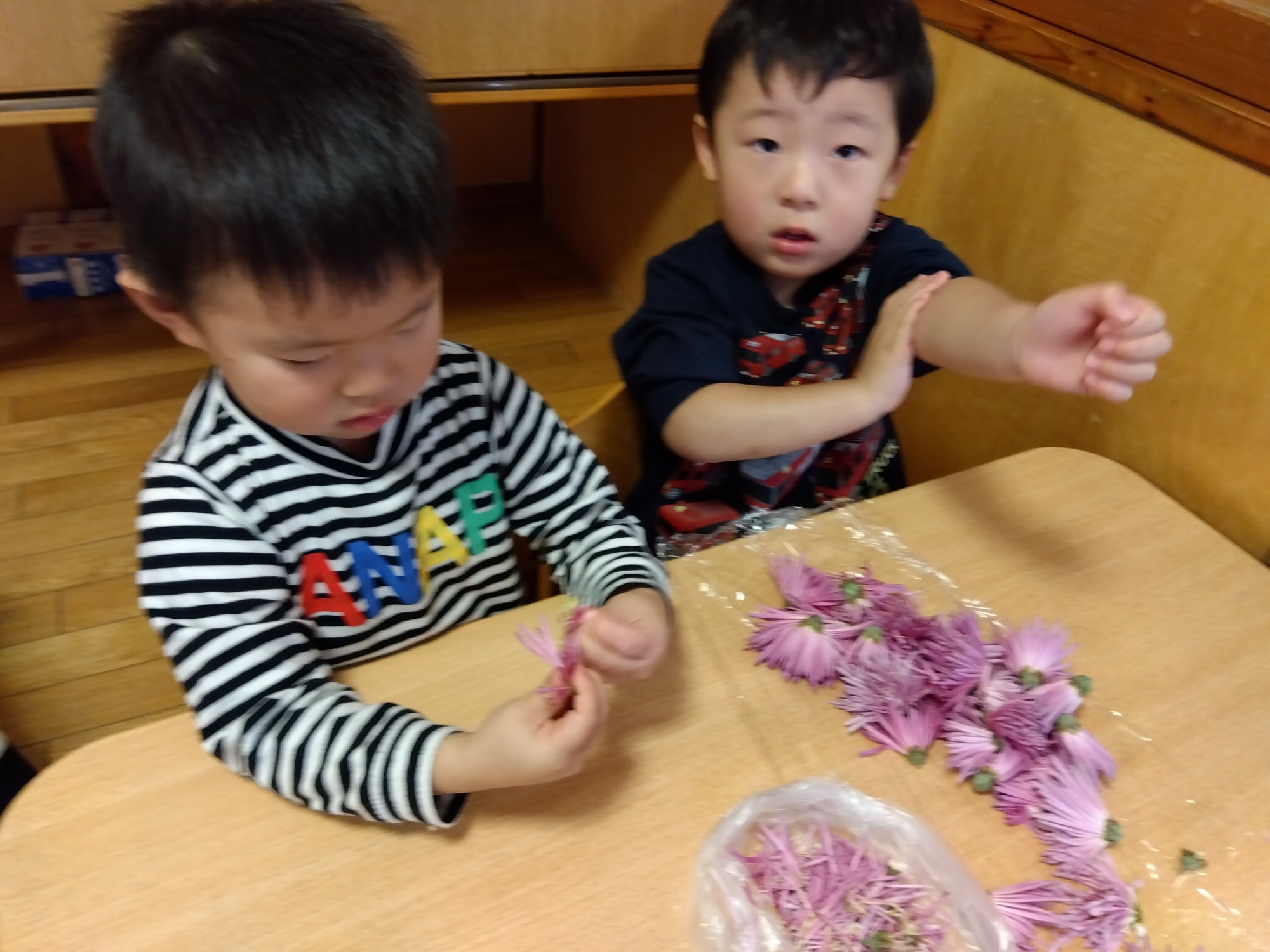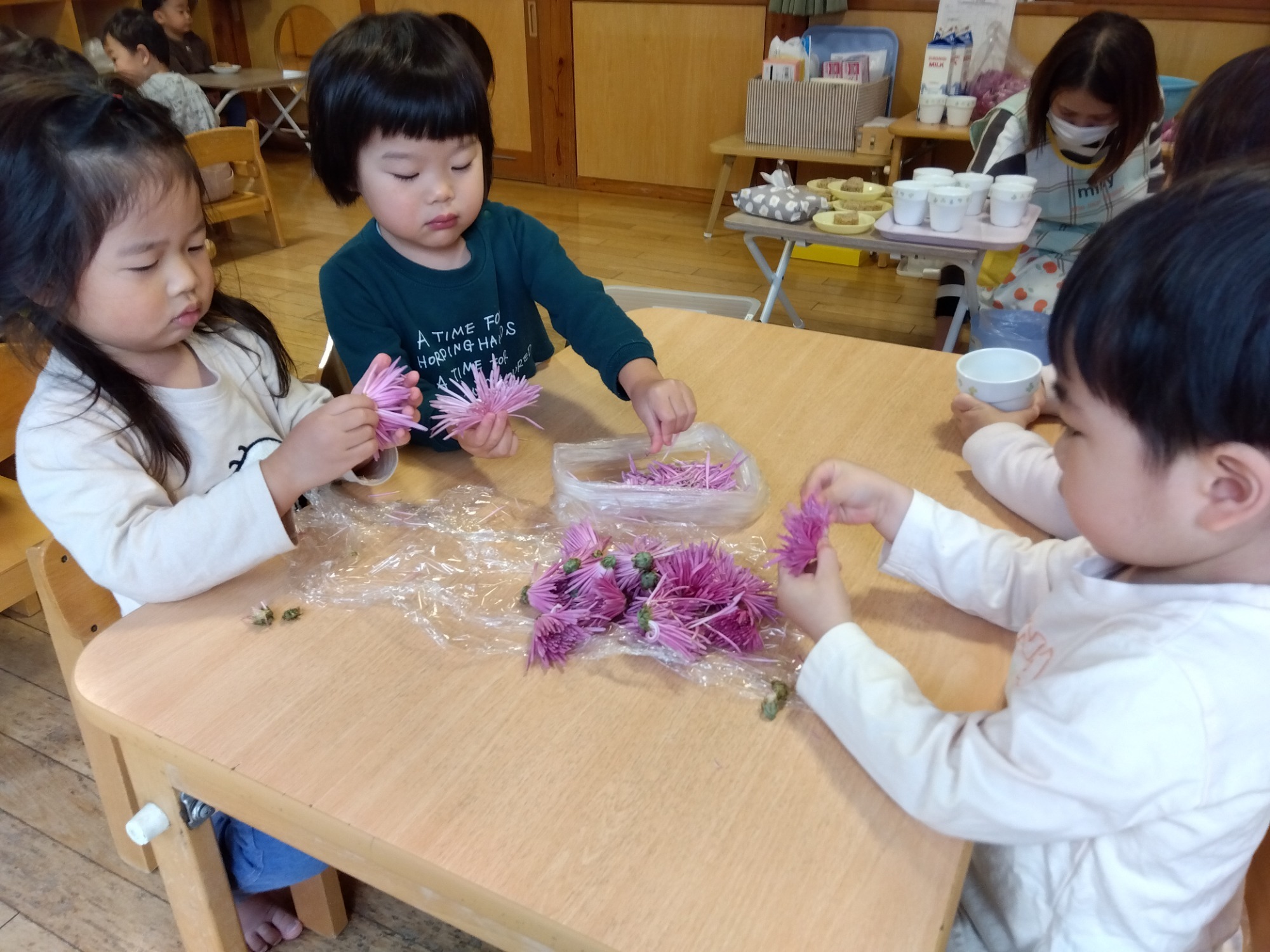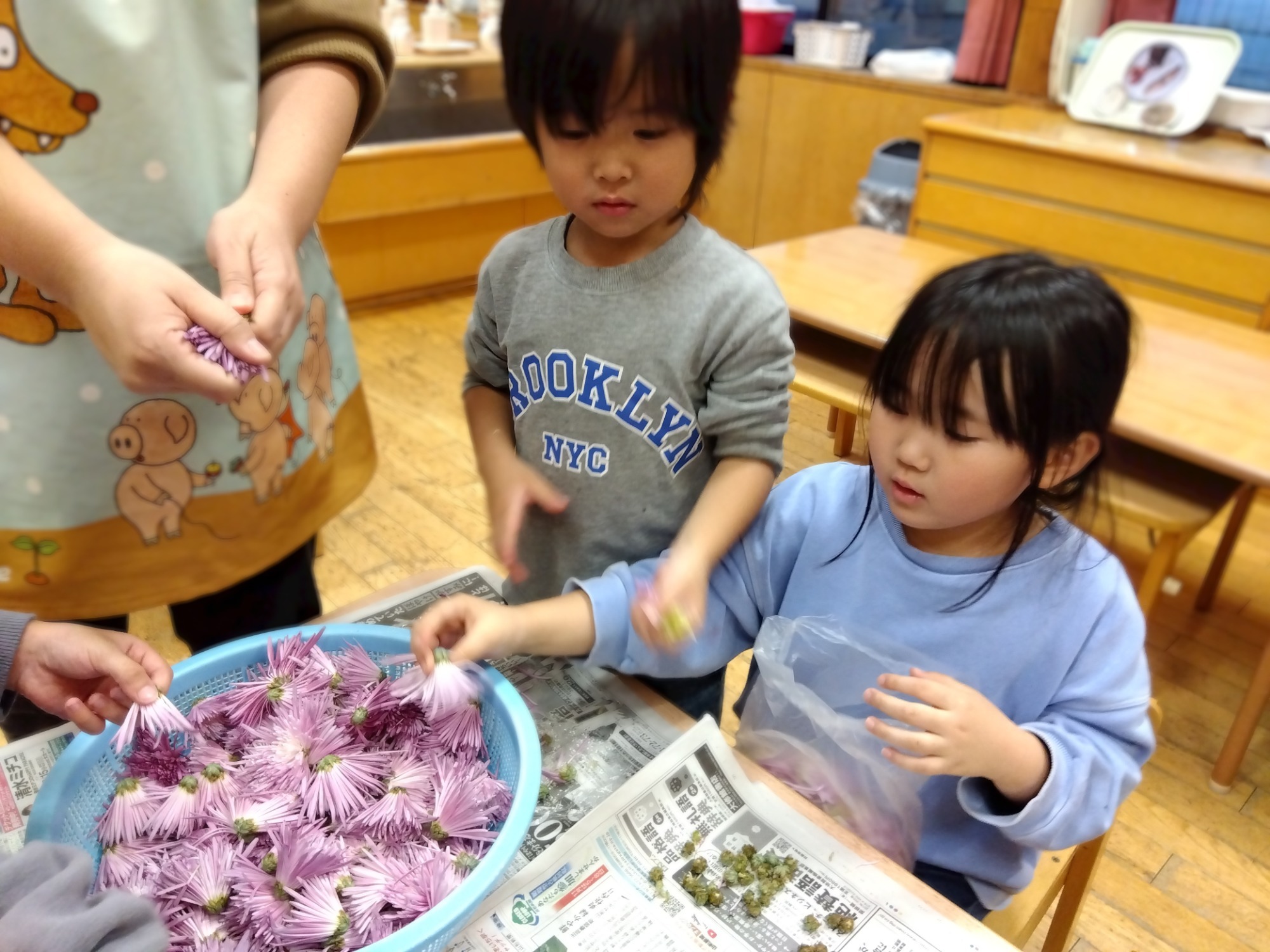 食用菊は山形ならではの食材。給食に使う菊の花の下準備を2歳児クラスひかり組のこどもたちがお手伝いしました。
