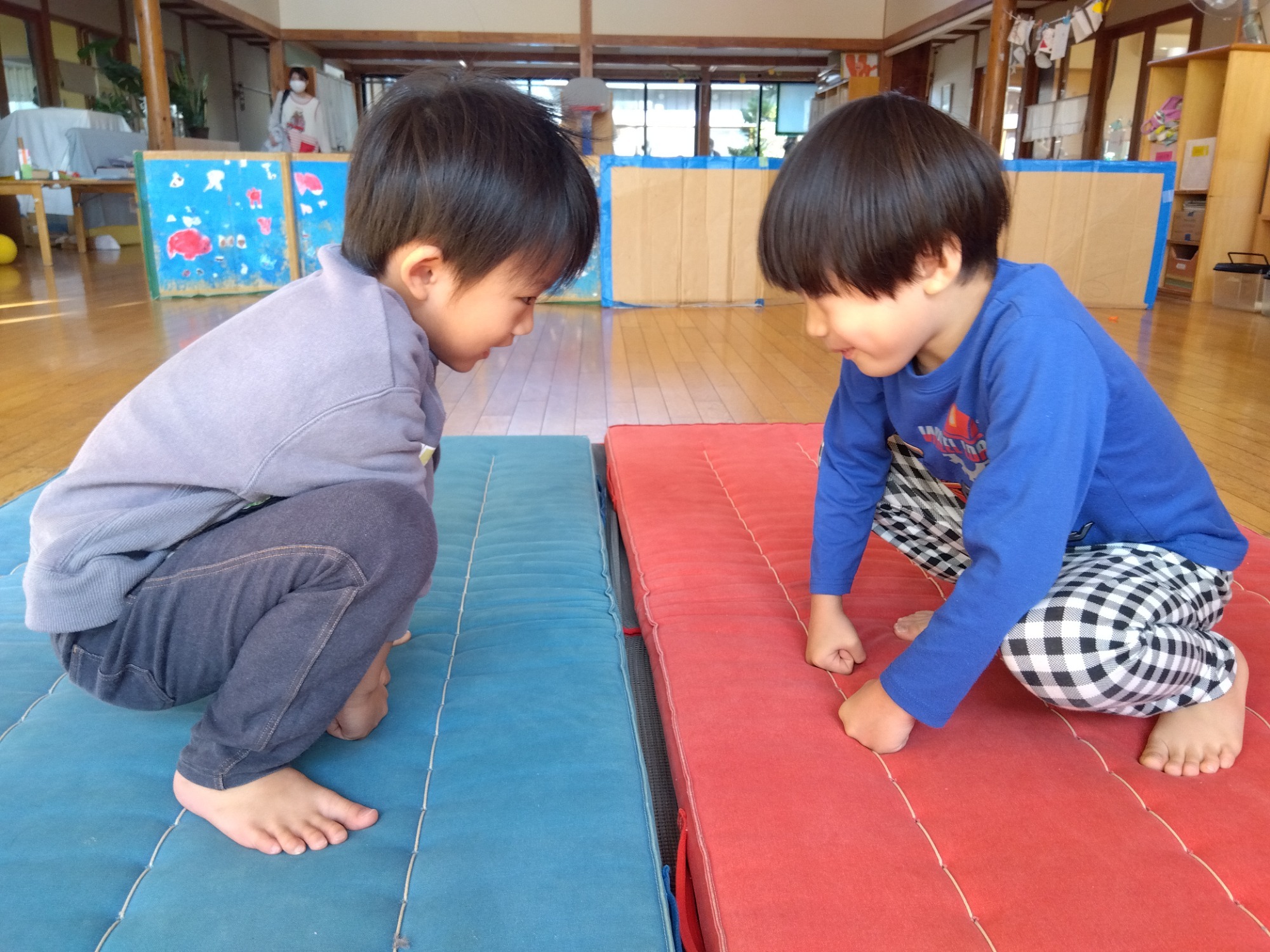 ある時のホールの様子、「すもうしよう!」と子ども達。真剣に遊ぶ中で、相手と対等に力比べをしたり、小さい子相手に少しだけ加減したり、人との関わりを学んでいる真っ最中です。
