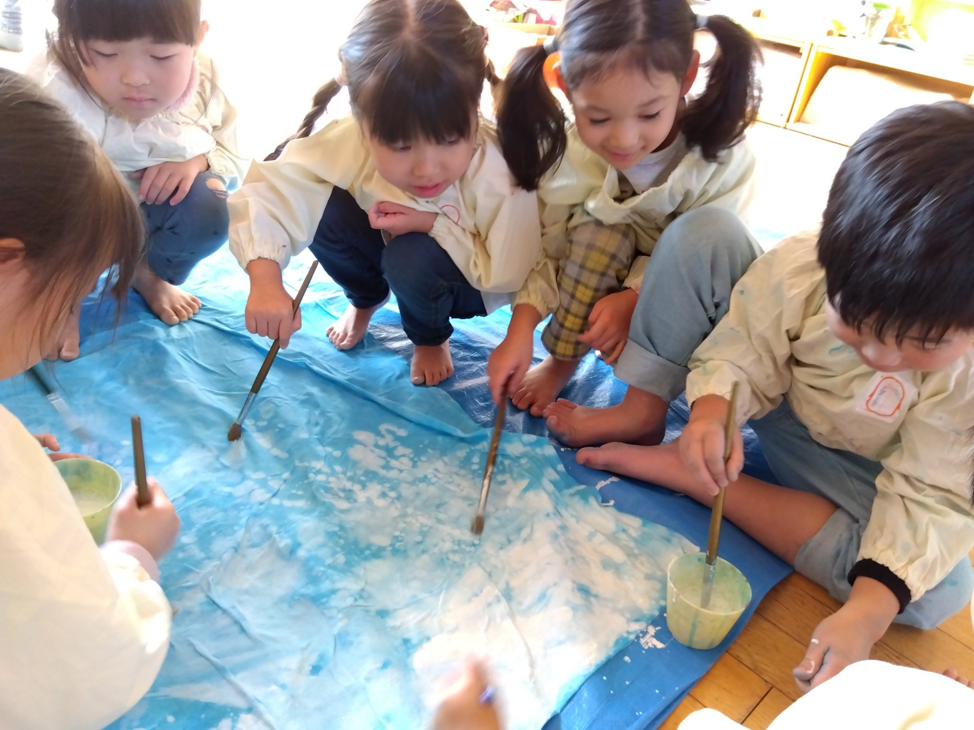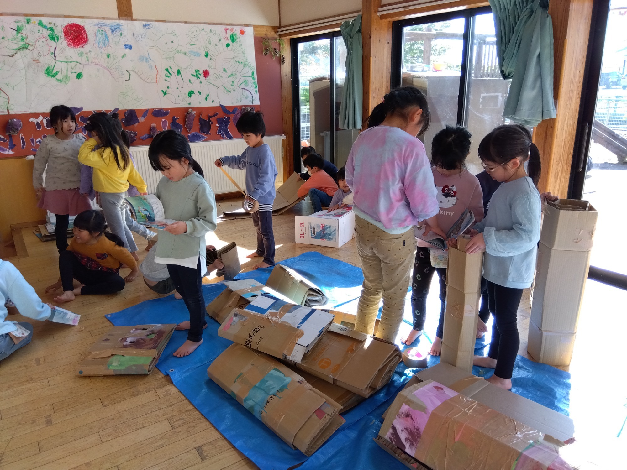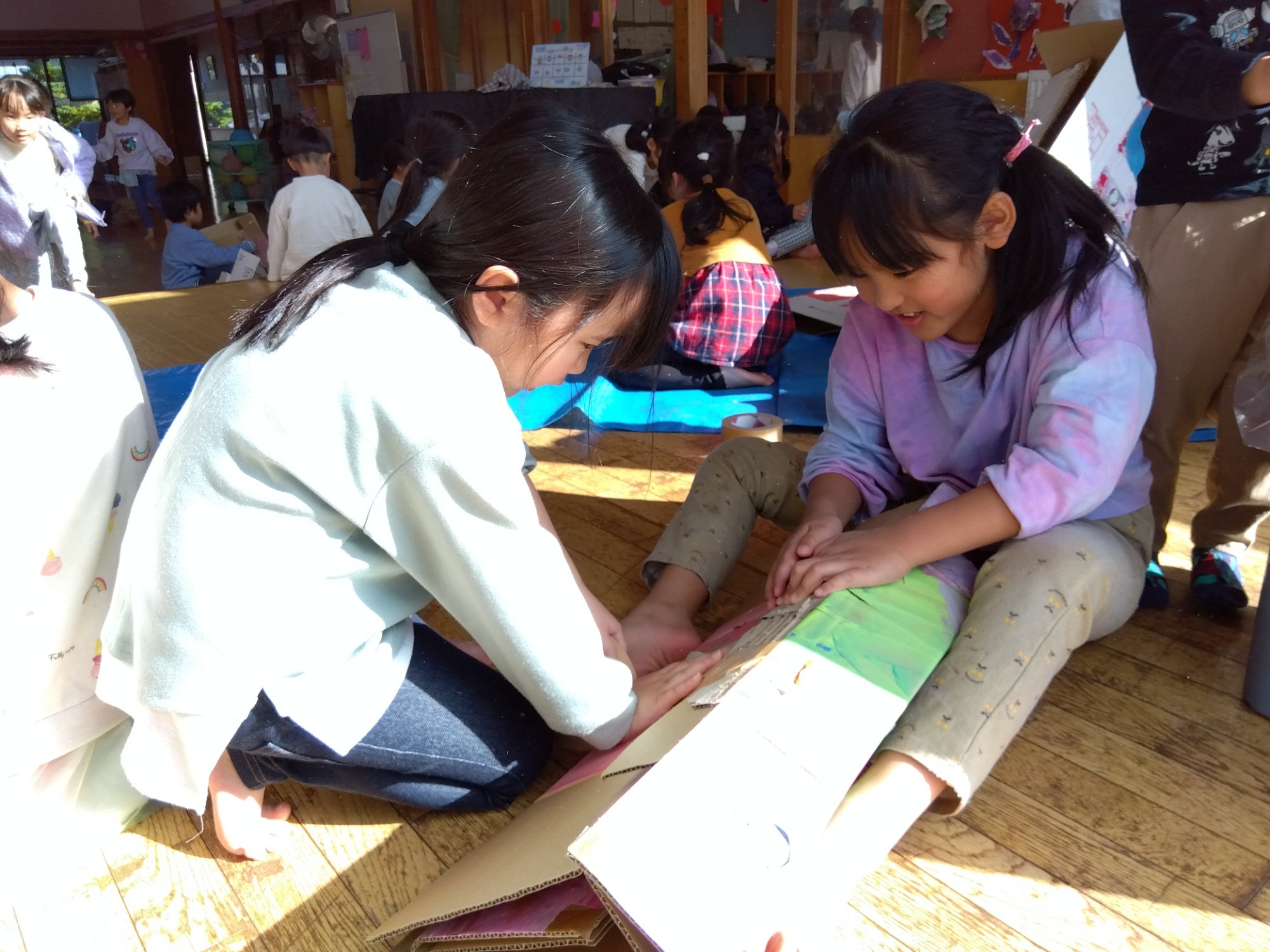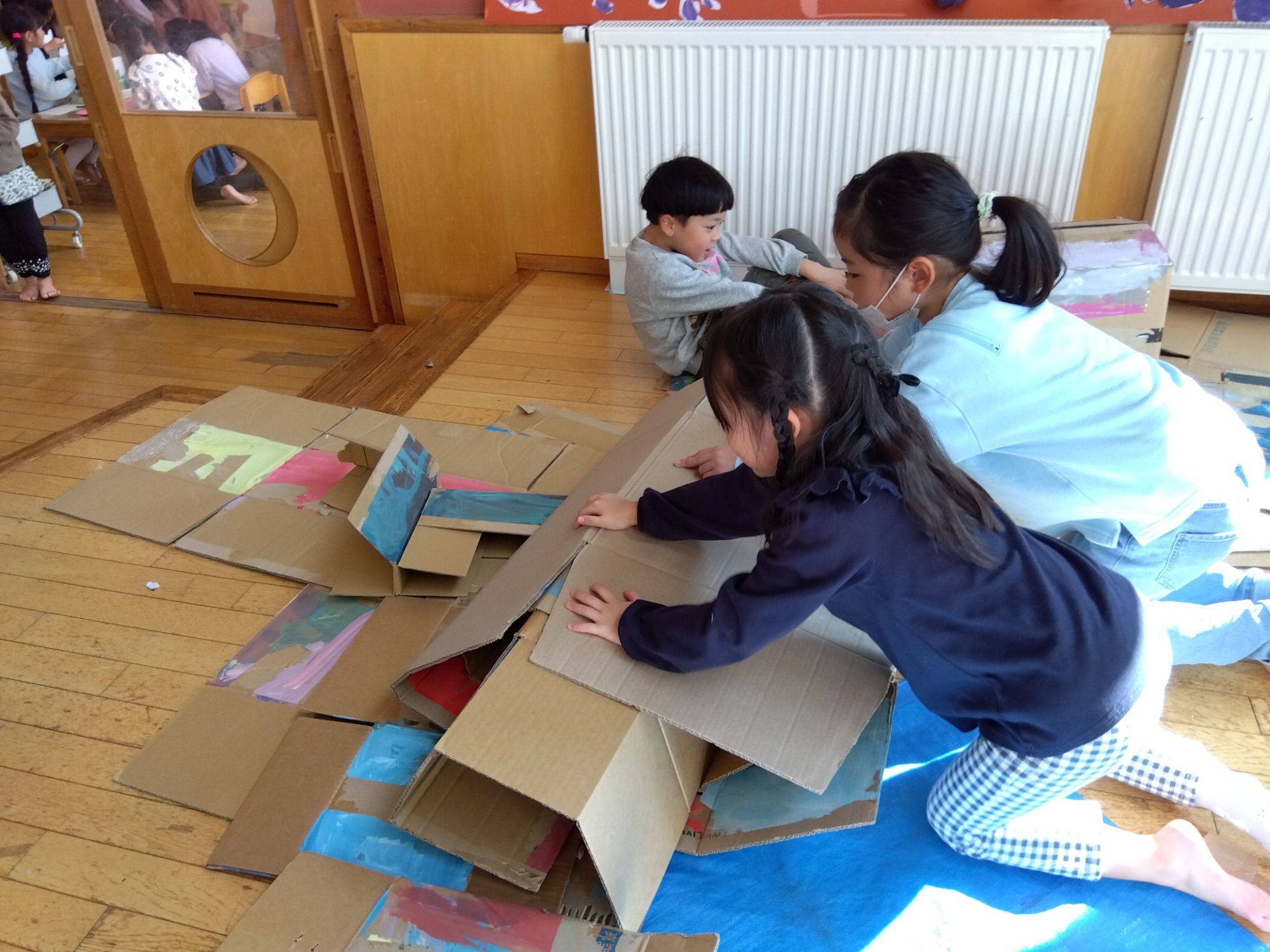 つき組も劇遊びの中で使う『おうち』をどうしようか、みんなでイメージを出し合って製作が始まりました。