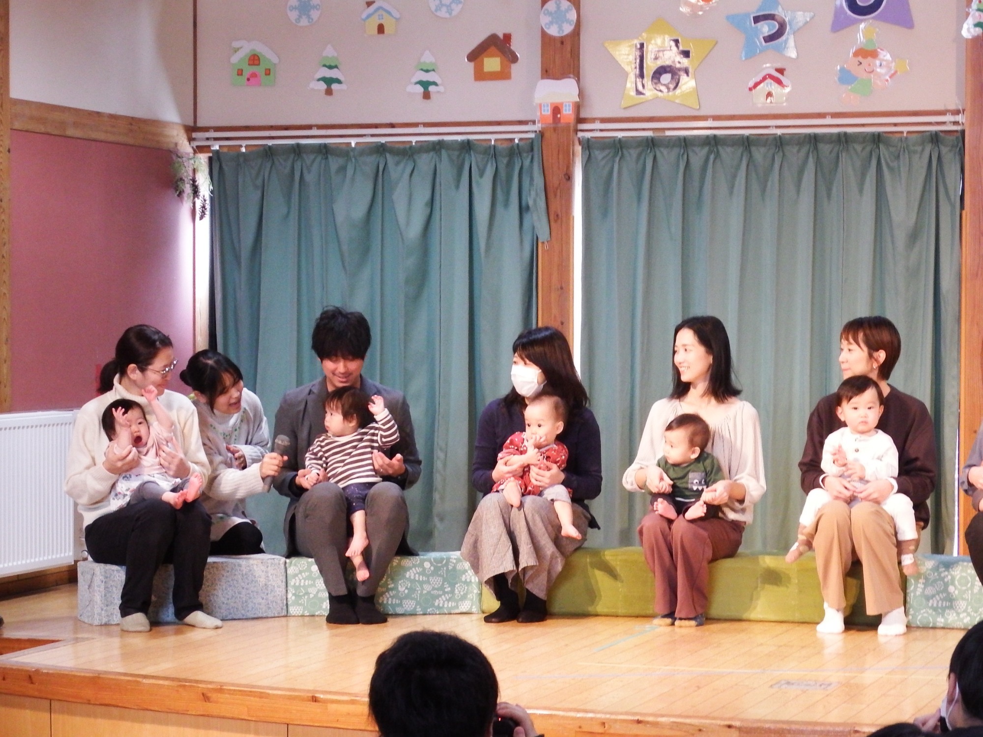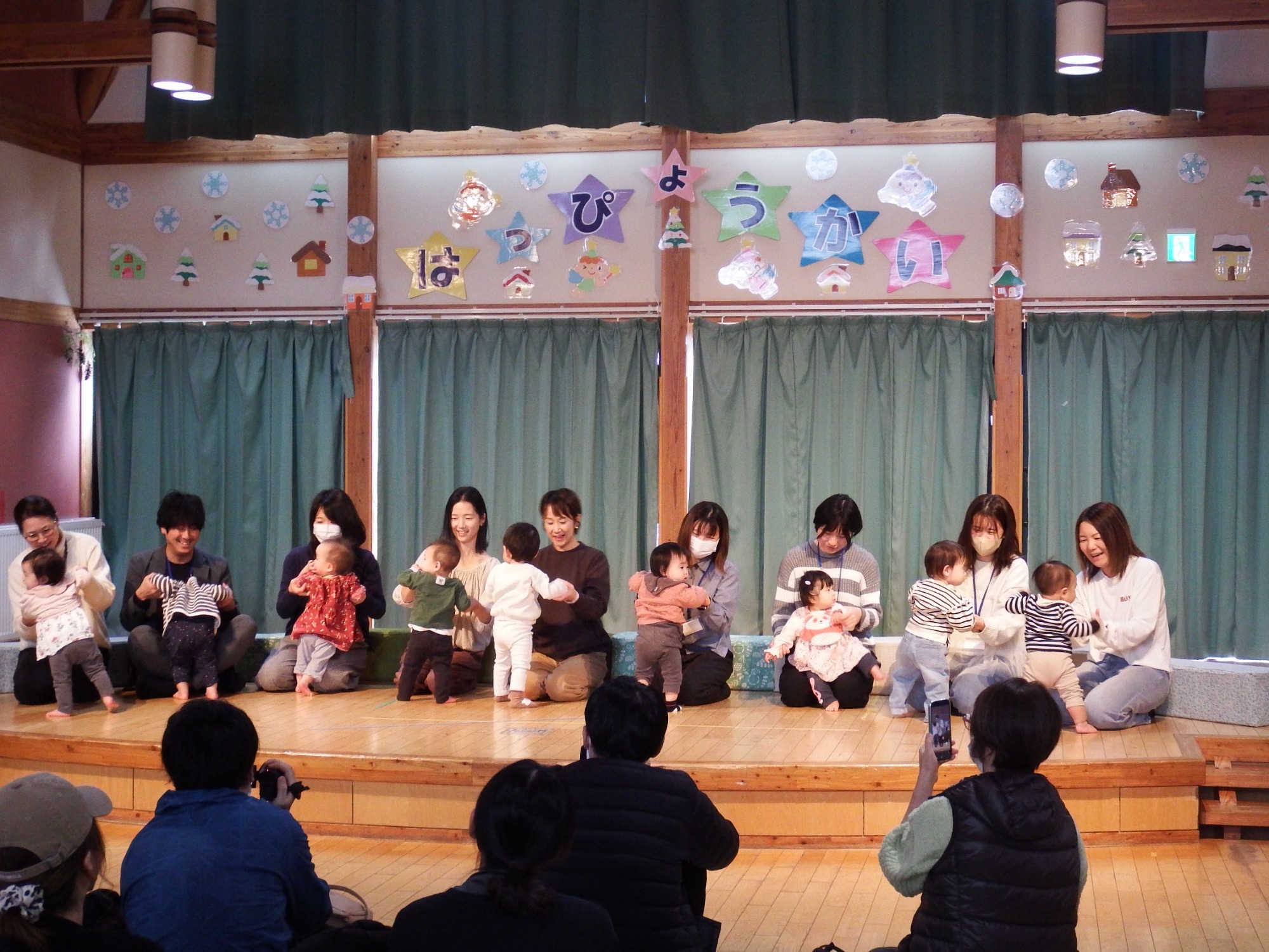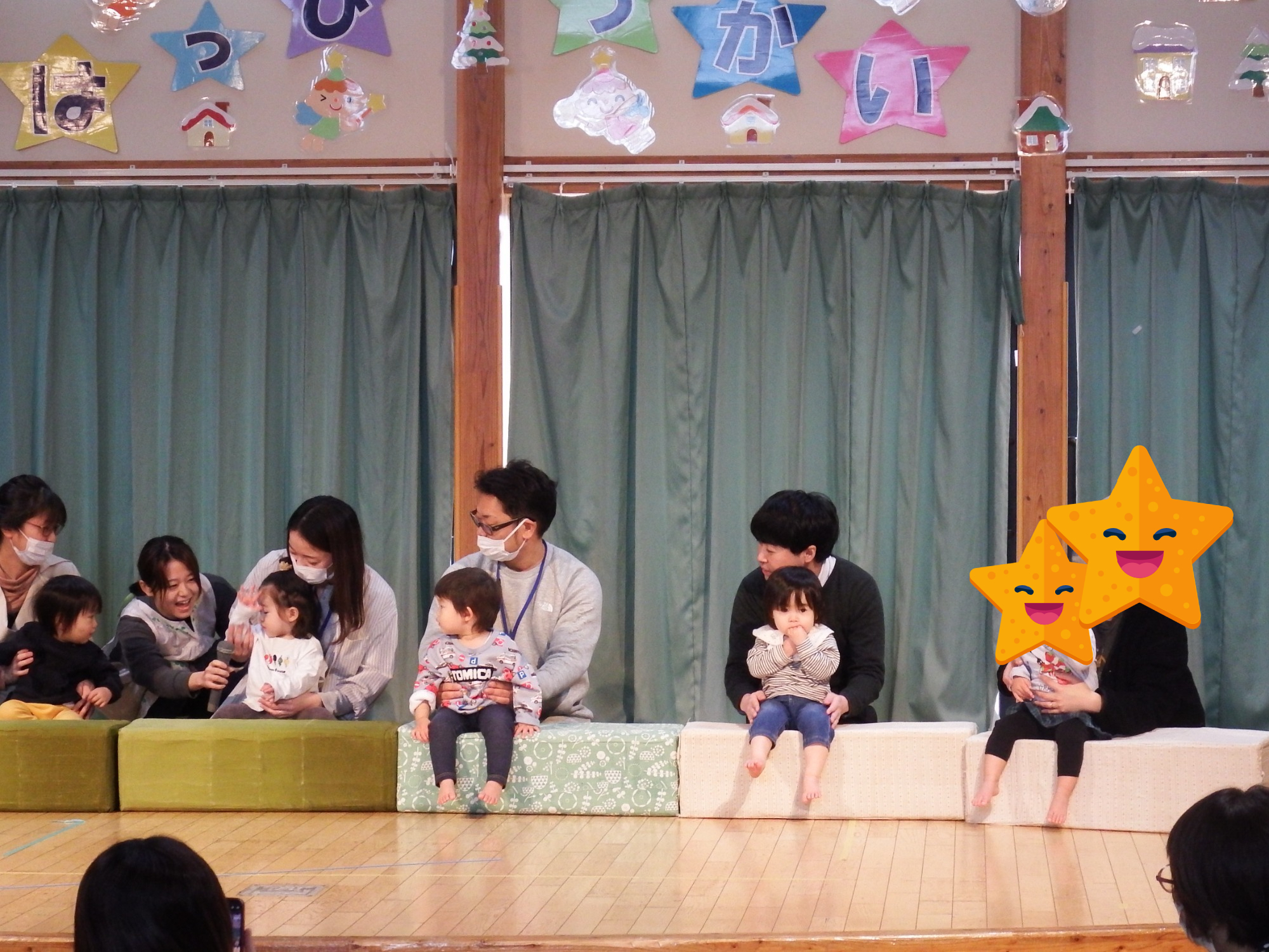 ほし組さんは、お父さんお母さんと一緒にステージにあがり、可愛らしいしぐさや表情を見せていました。
