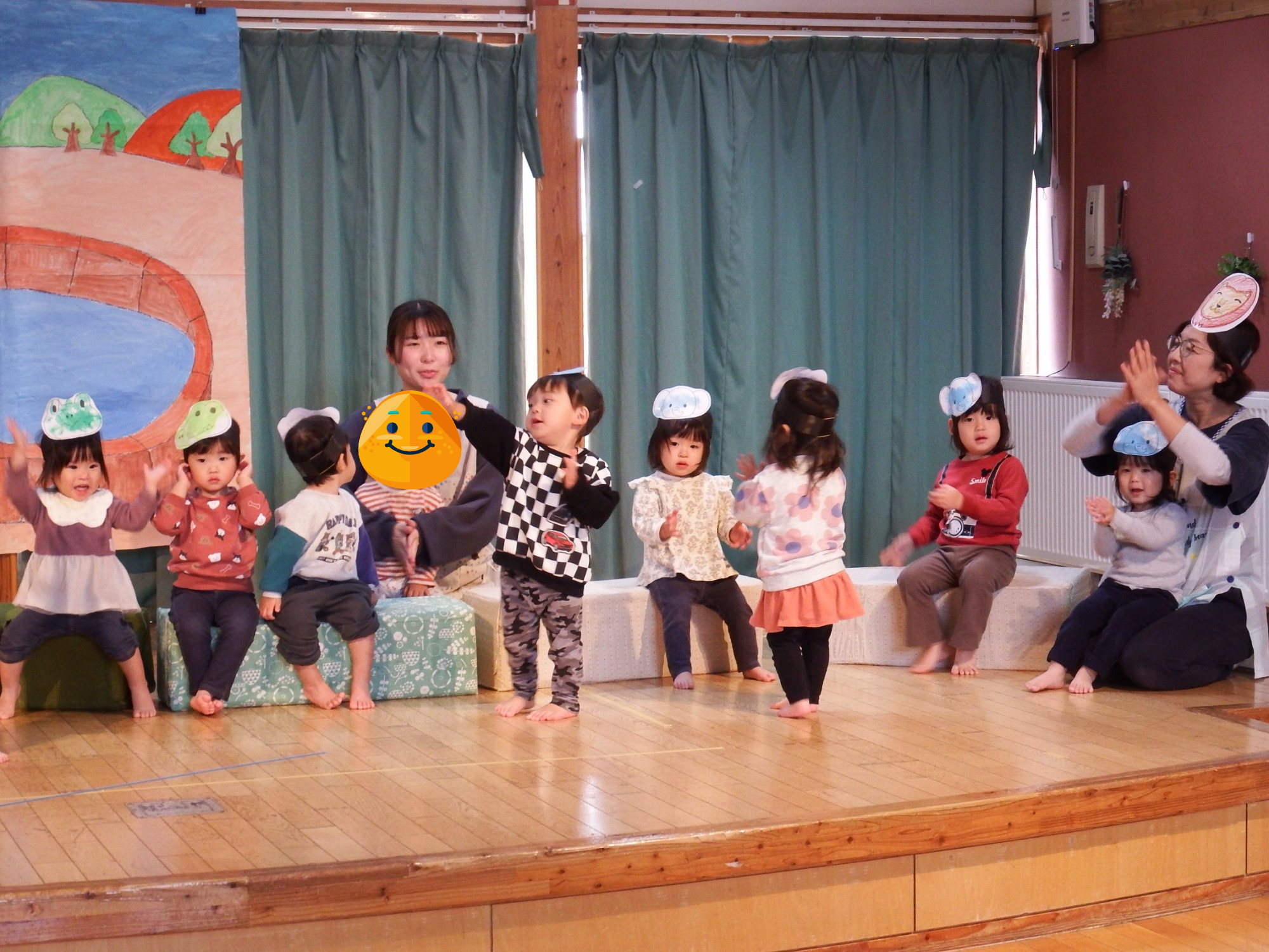 にじ組さんは、少し緊張の面持ちでいつも通りというよりは胸のドキドキがそのまま表れていました。(後日、子ども達だけで改めてステージで楽しんでみました。)