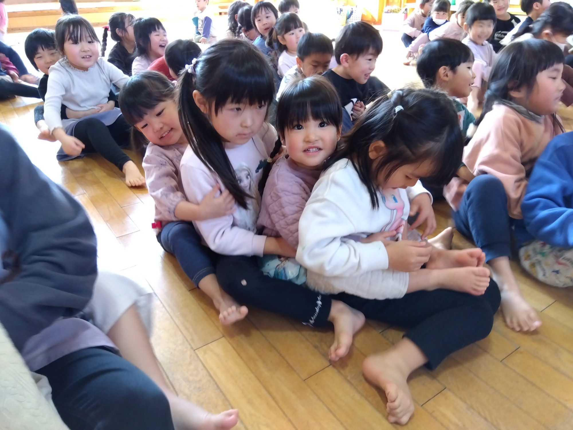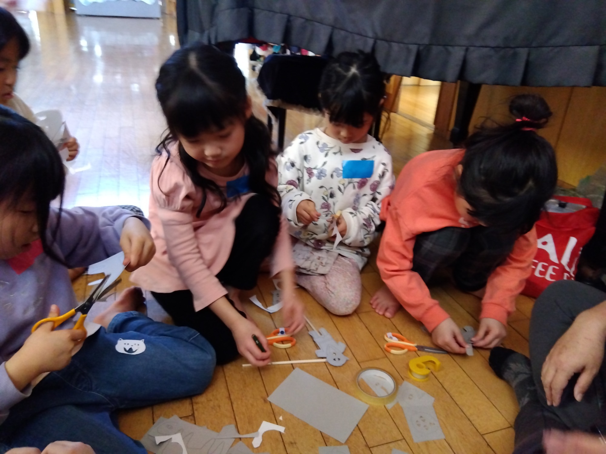 節分の朝、「鬼、くる?」「鬼から知らせがあった?」とドキドキした表情で聞いてくる子が数人、そうかと思えば「作戦、ばっちりだから大丈夫!」「みんなで豆投げれば鬼は逃げていくんだよ」と言う子もいます。「こわい」というそら組さんの中には「なかよしグループのたいようさんに守ってもらうんだ!」と年長さんを心強く思っている子もいました。