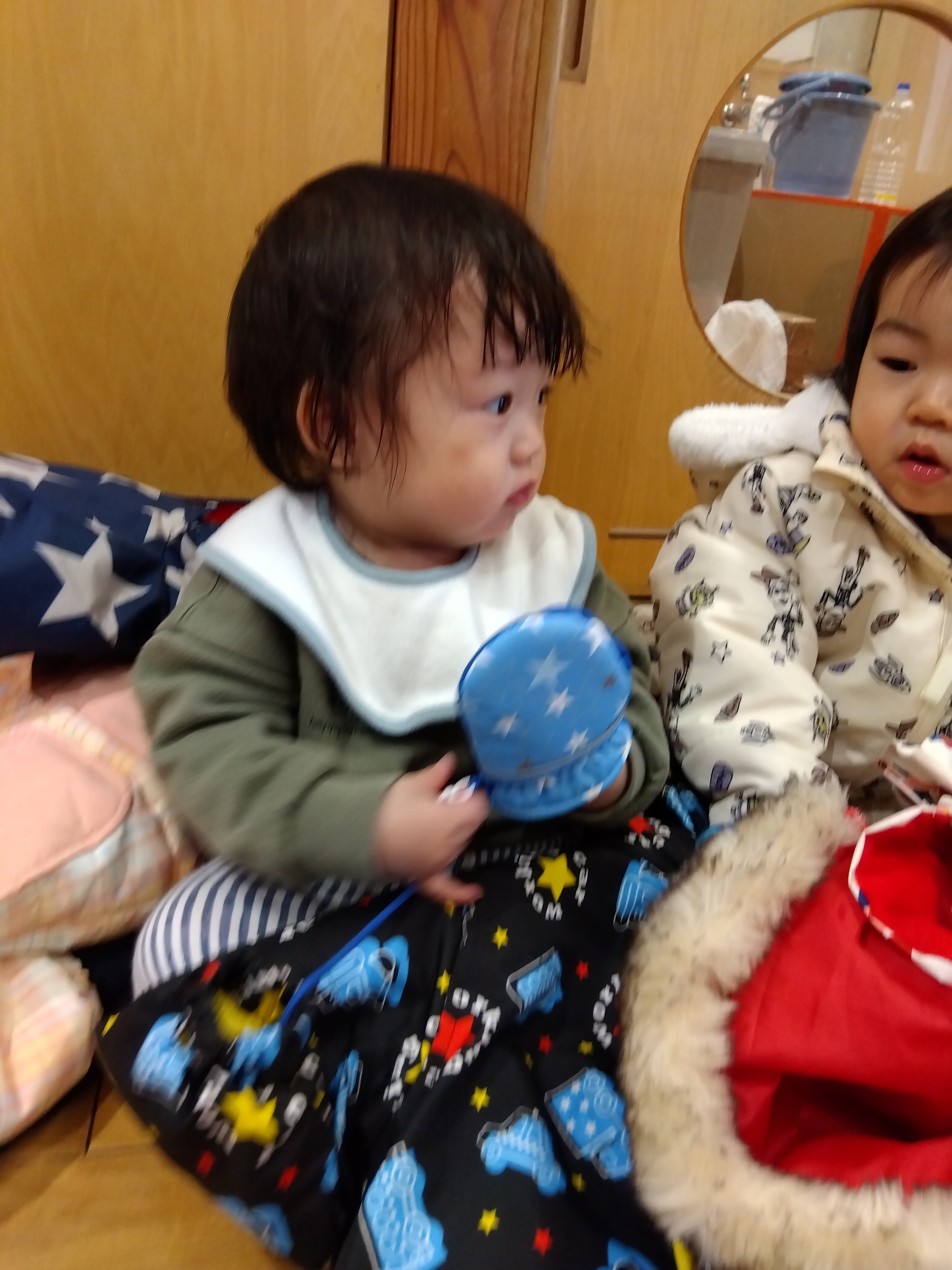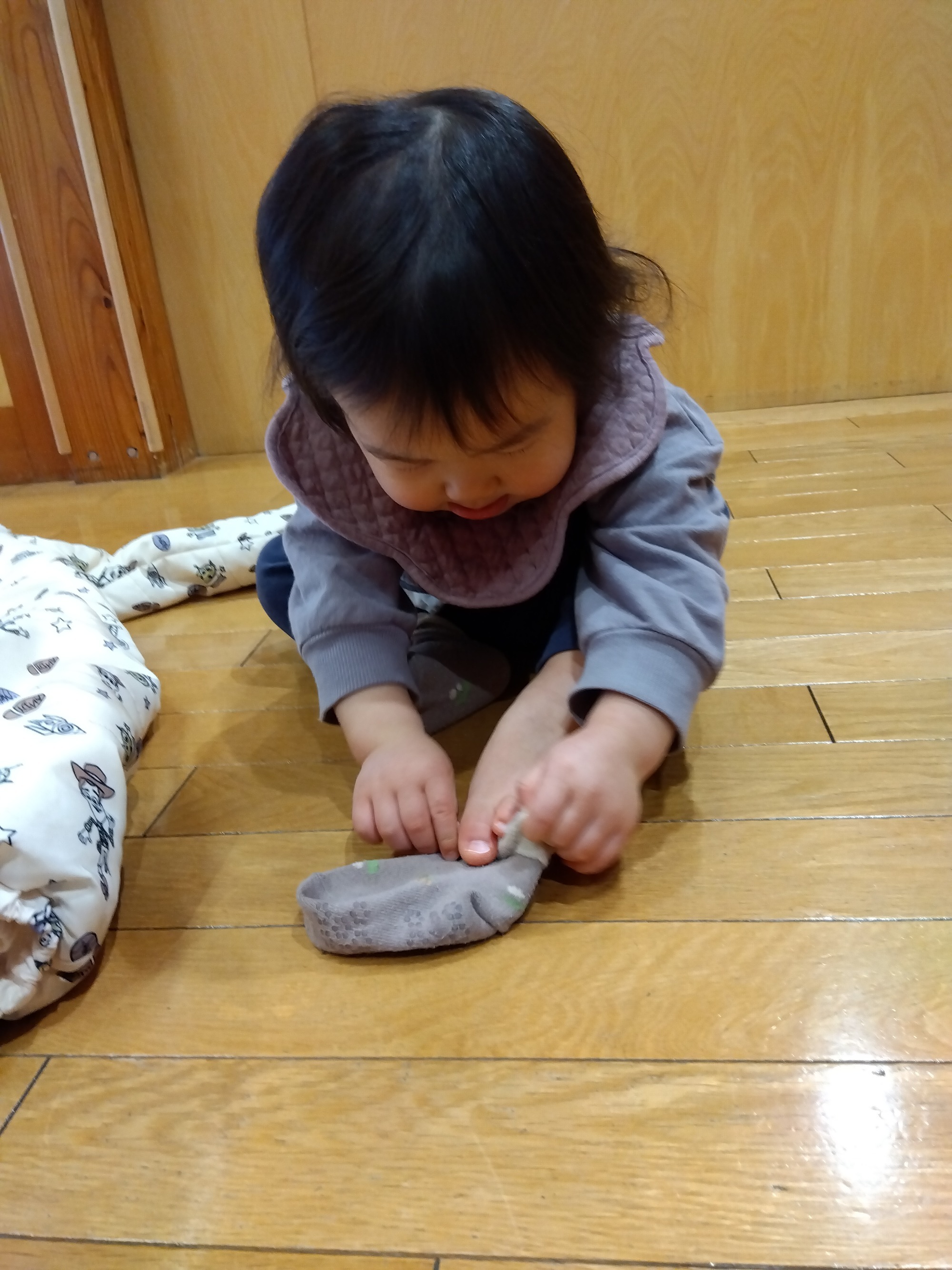 中には自分で靴下を履こうとする子も・・・
