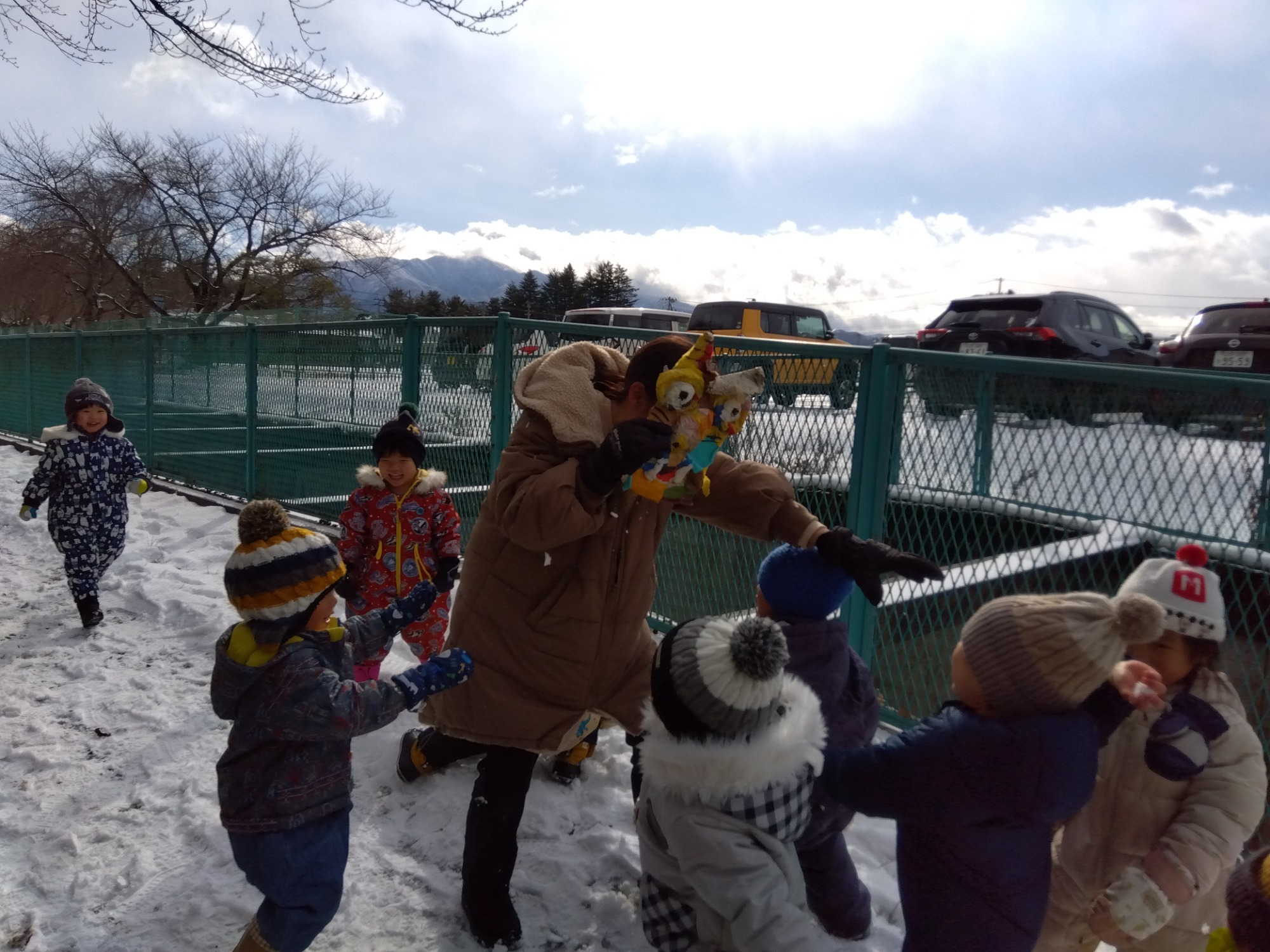 オニが来たら豆をまくよね・・・ということで、保育者をオニに、雪をオニが苦手な豆にみたててオニ退治をして遊んだひかり組さんです。
