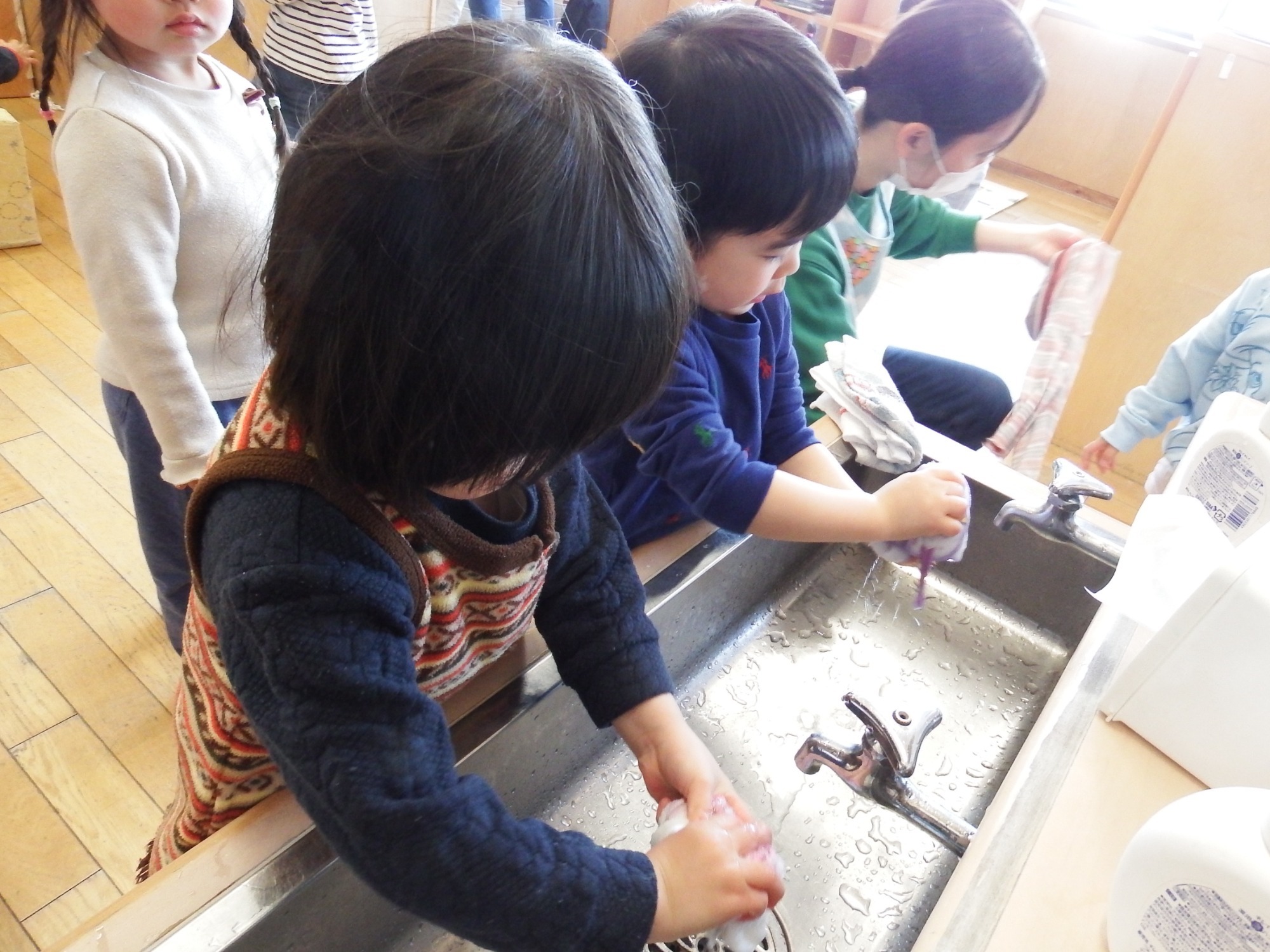 食事時に使うおしぼりを保育者が水で濡らして絞っていると「やりたい!」「おてつだいしたい」の声があふれてきました。