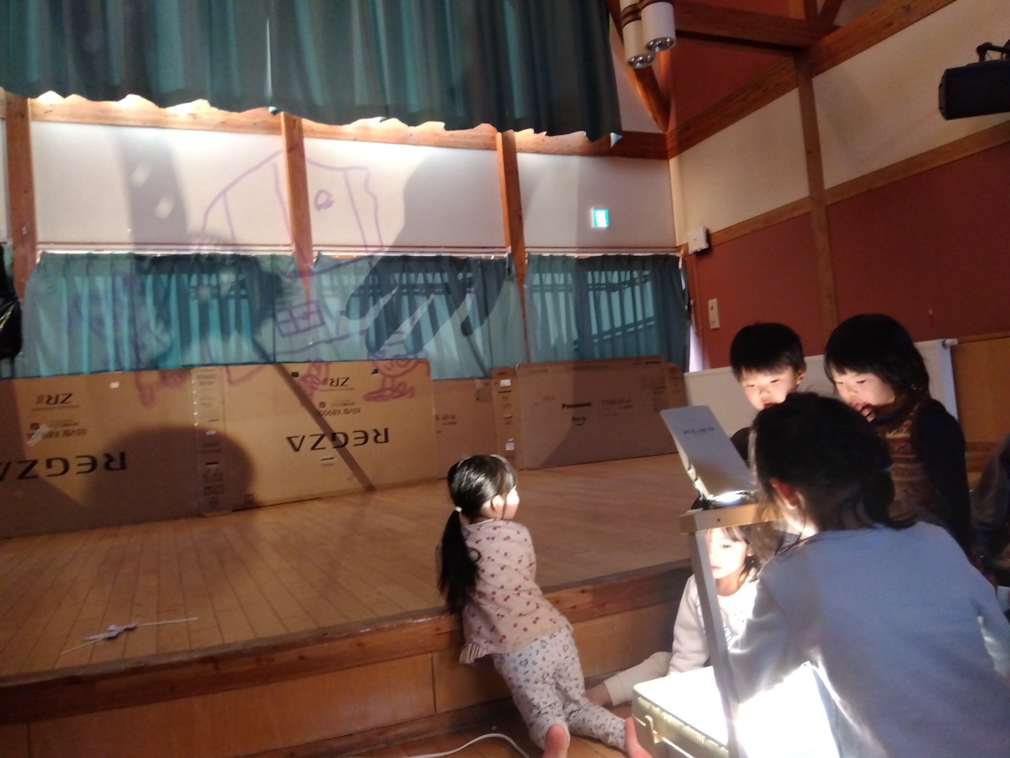 造形遊びの矢作先生と一緒に、光と影の不思議さを感じて遊びました。