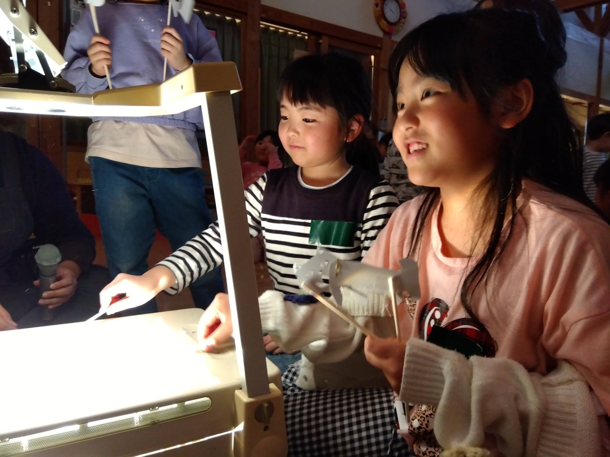 たいよう組の子ども達はおばけをテーマにつくったペープサートやセロファンをOHPで壁に映し出し、自分で操作しながら色や大きさを楽しみました。
